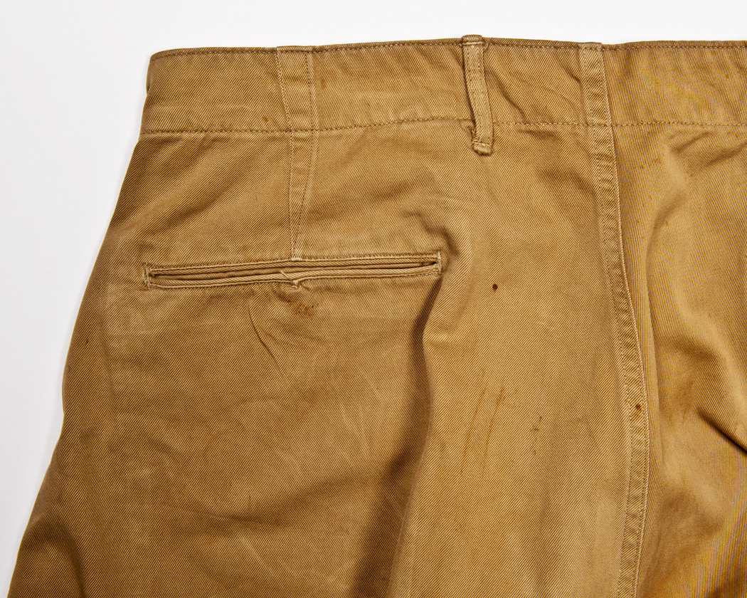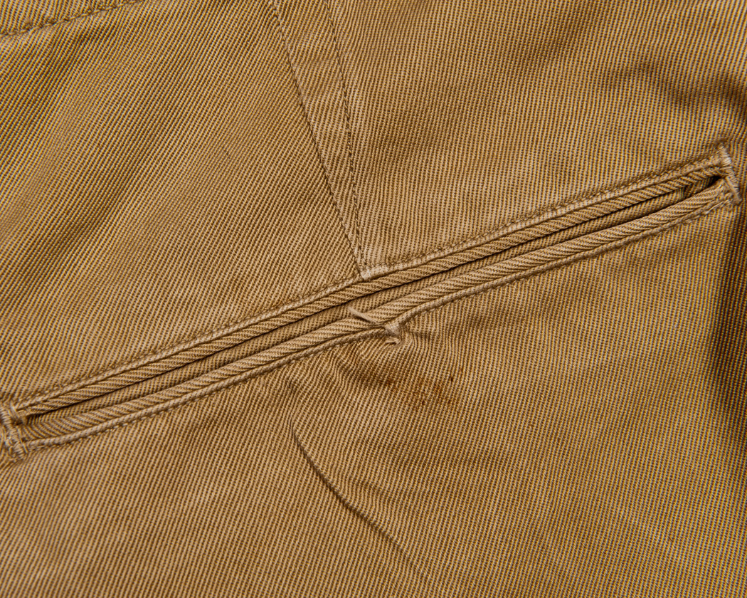 ダーツのつまみ方がポイントで、ウェストを後でチェーンステッチミシン、上下一気に縫うため上下で差寸が大きすぎると長い側(ステッチでいうと下側)をつまんでしまいます。それを避けるために、少しまっすぐ行ってから、あらためて三角にダーツを取っています。微妙な部分ですが、本当に上手いとしか言いようがない作りです。