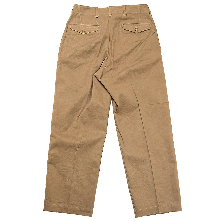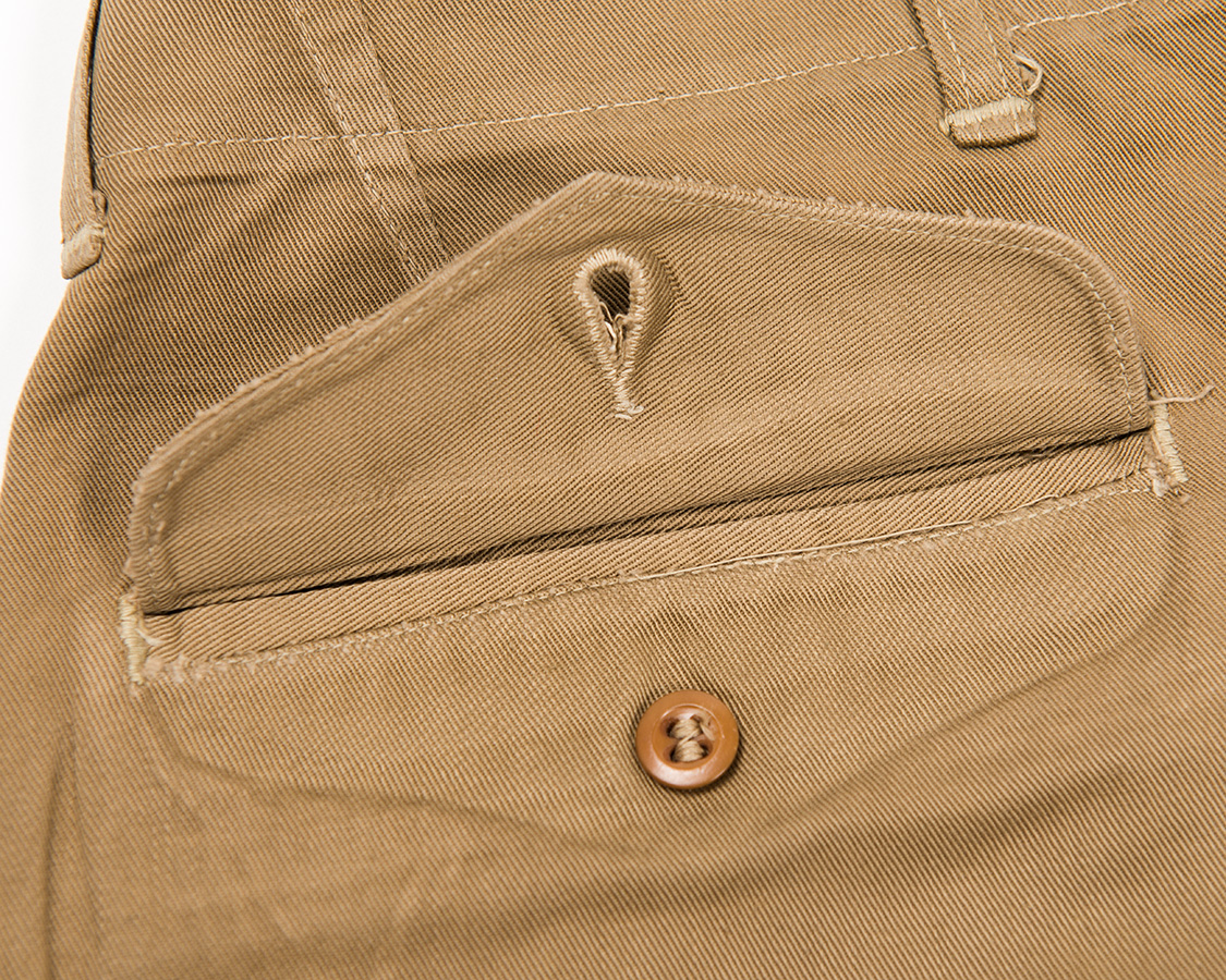 一説には分量を多く取るには斜めの方が良いなどともいわれますが、単純に分量を綺麗に取るならばArmy Officer's Trousersのように二本別で取った方が自然な丸みが出ます。
