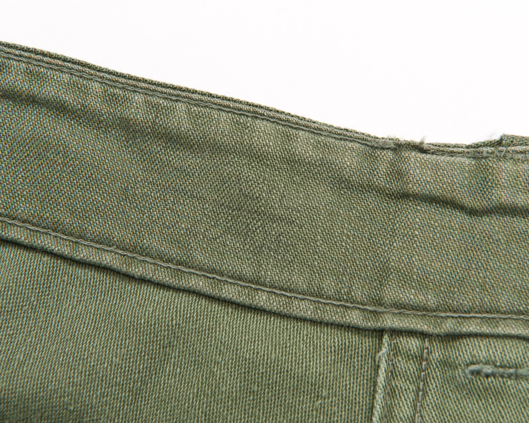 腰裏はチェーンステッチ。ジーンズなどと違い、身頃の一番上を折り曲げ、裏に生地を当てながら縫っていく、俗に「身頃帯」や「見返し始末」などと呼ばれる仕様です。