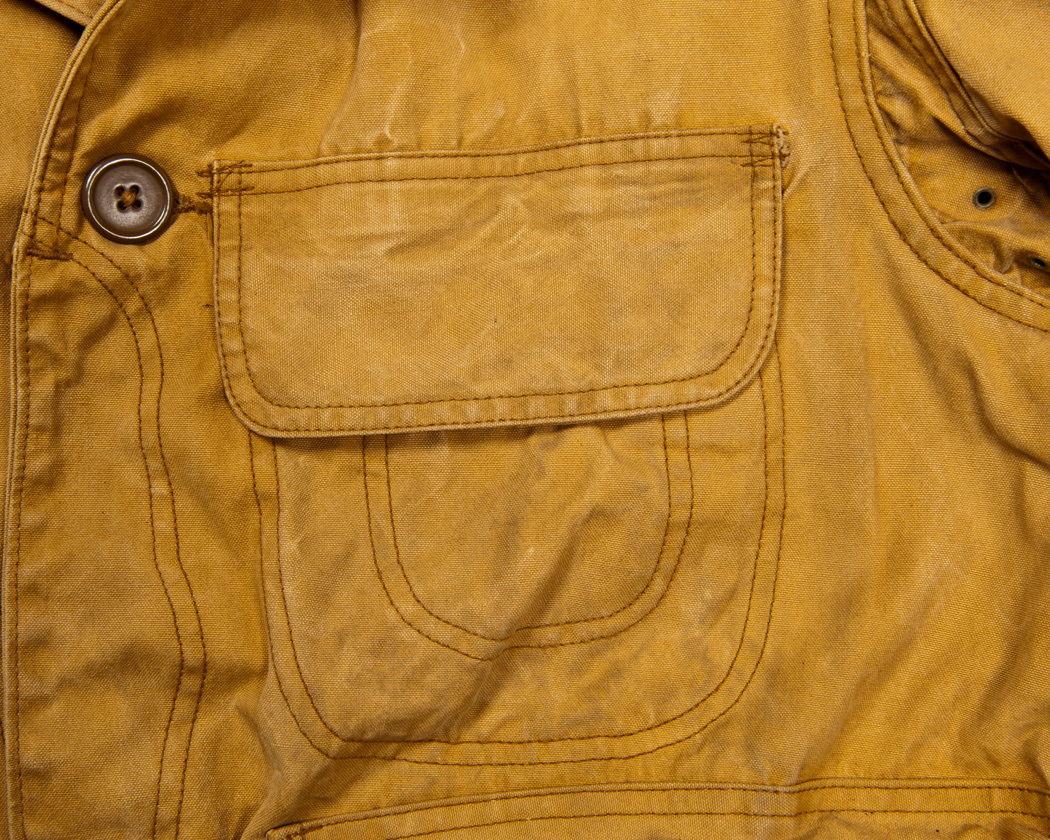 胸の二重ポケット。玉ぶちが二重に切られ、フラップがつけられています。