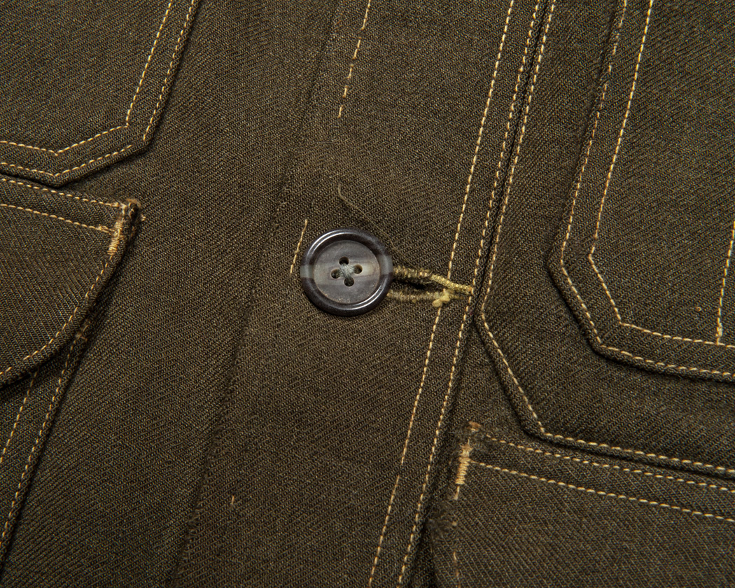 前立て部分。本来4本ステッチが走っているのですが、端の二本はきこまれてかすれ消えてしまっています。