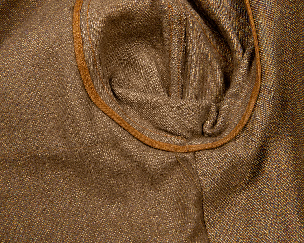 もう少し年代が後のハンティングジャケットあたりであれば、袖も二重、袖ぐりはロック+ステッチで作られるところですが、このジャケットは丁寧にパイピング仕上げです。