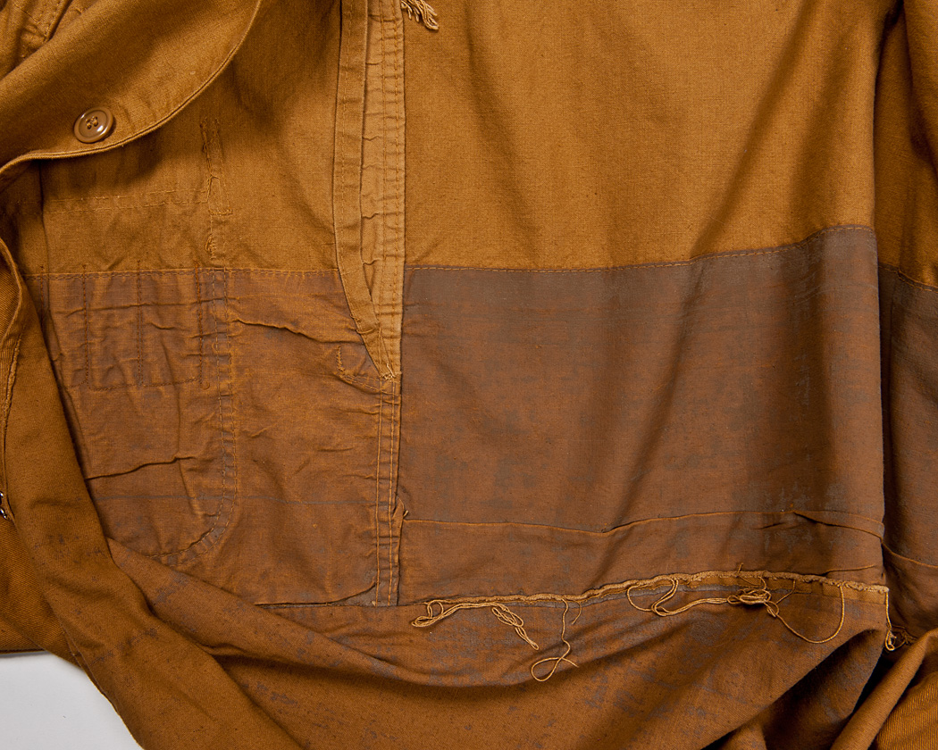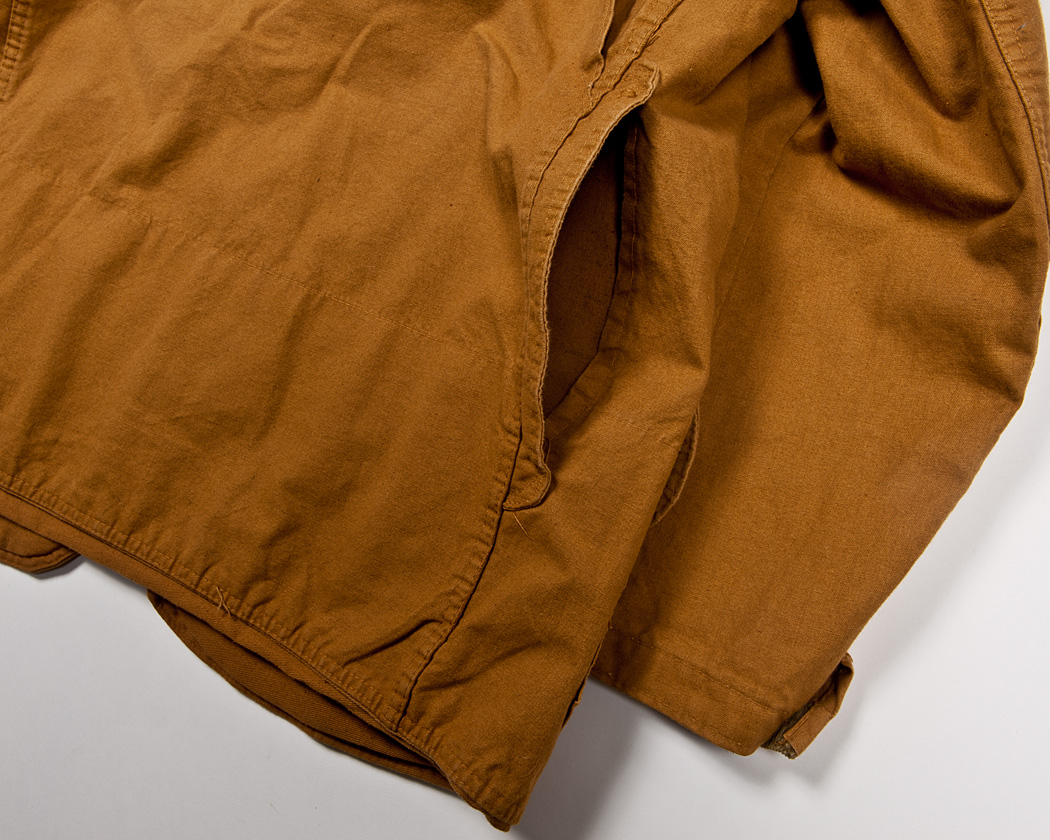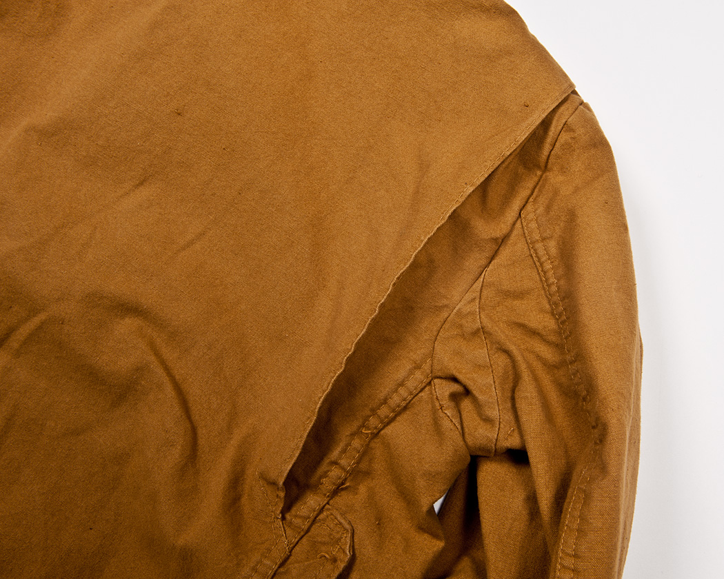 古くからある、体を動かした時に背中が釣って、動きにくくなるのを防ぐ仕様です。単純にゆとりを増やしてシルエットをゆったりさせるのではなく、体が動いたときだけ開くように生地をたたんで縫いあげています。