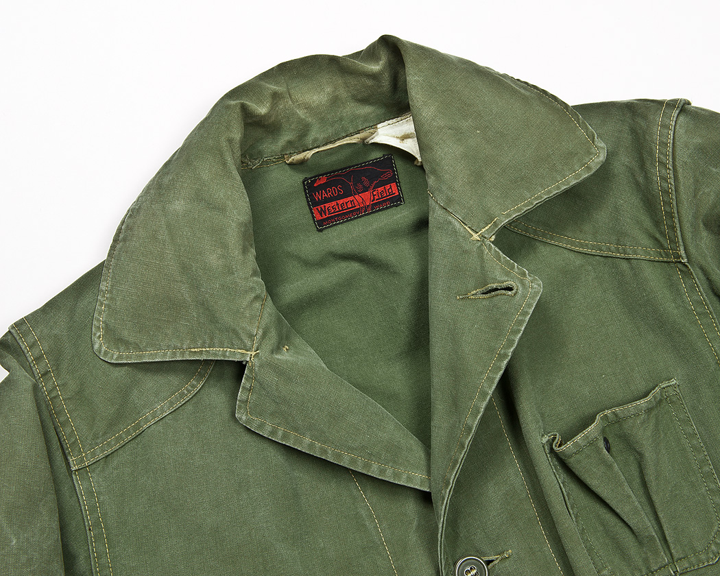 肩には当て布。ラベルは鳥が飛んでいる、典型的なハンティングジャケットらしいデザインです。