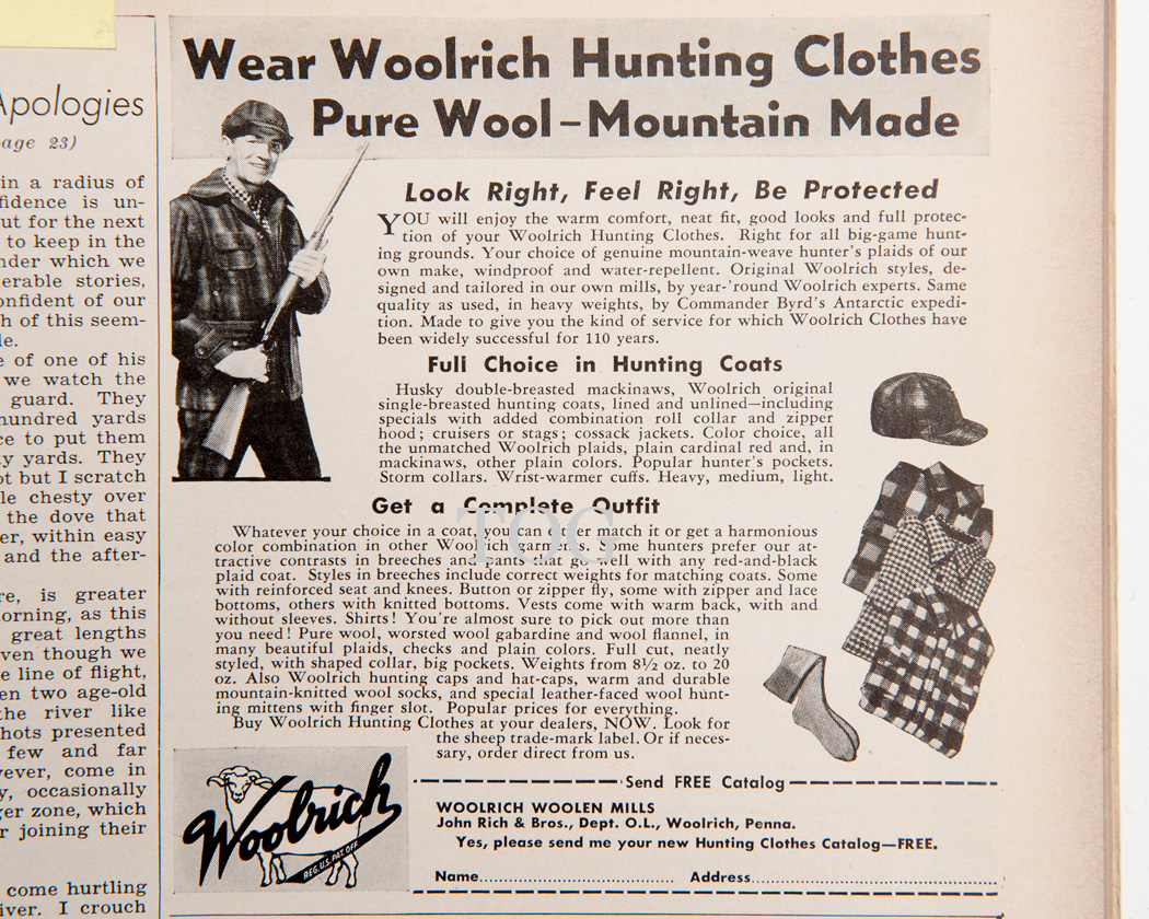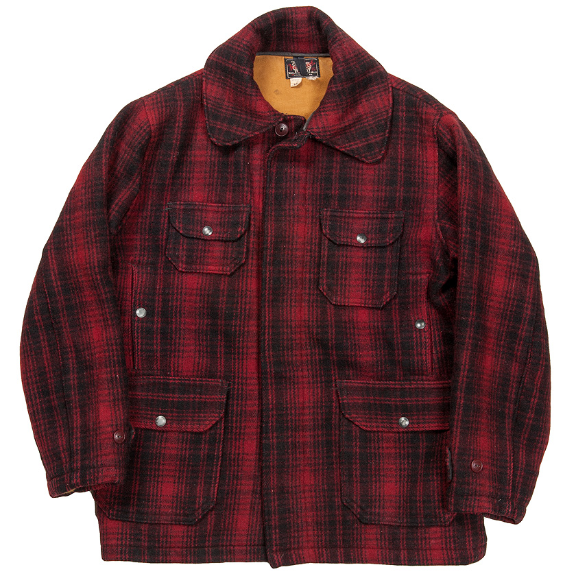 ウールリッチのハンティングコート。1940年のカタログにもその写真はあり、胸の左右非対称ポケット、その下のハンドウォーマー、腰のポケットとデザインはそのまま。