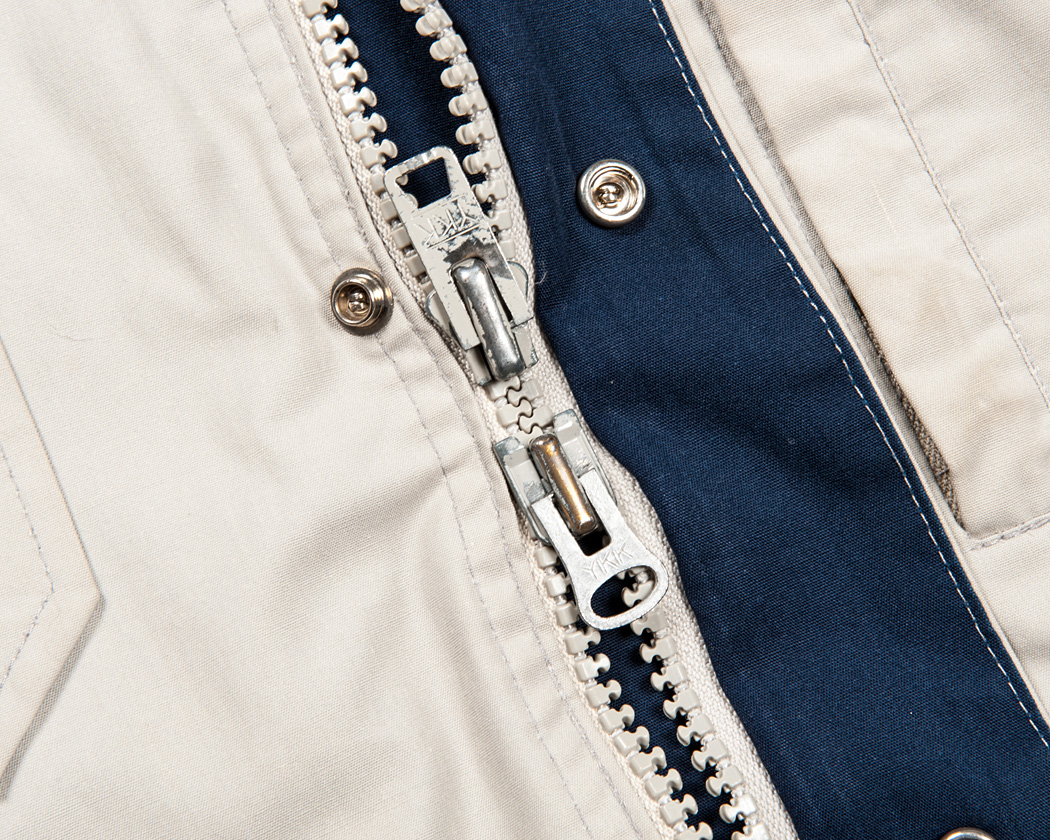 ファスナーはダブルファスナー(逆開)。ファスナーの引き手・本体部分は金属に塗装、ムシは樹脂。このチープな感じがかえってマウンテンパーカーには良く似合っています。