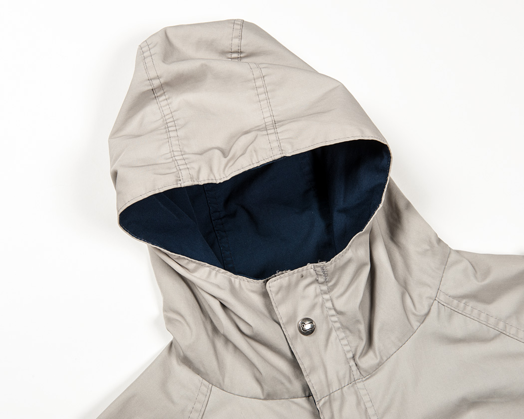 フードと本体の縫い合わせは地縫いのみ。ステッチがかかっていません。またフード部分のボタンも一つだけ。