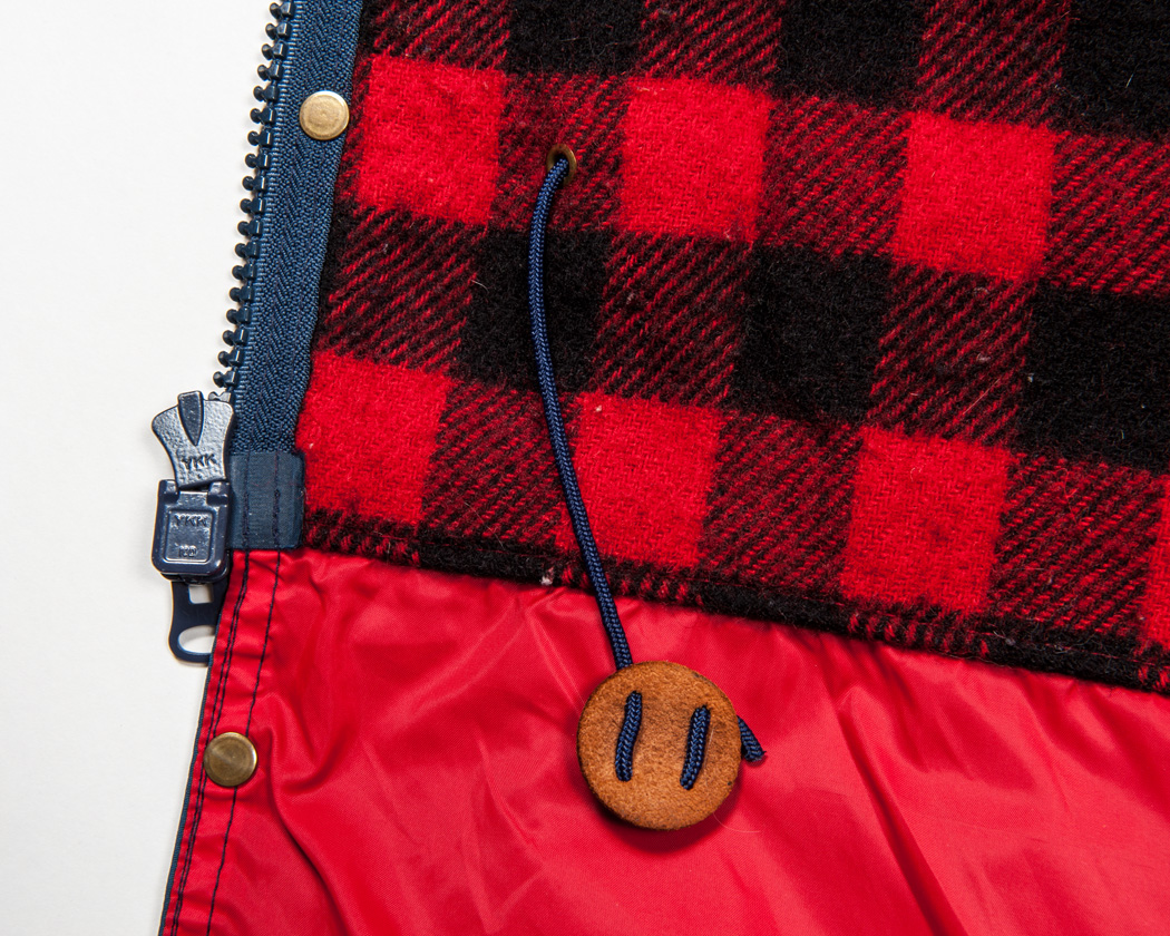 ウェスト部分にもフィット感を調節するための紐が入っています。その先は、フードと同じく革で止めがついています。