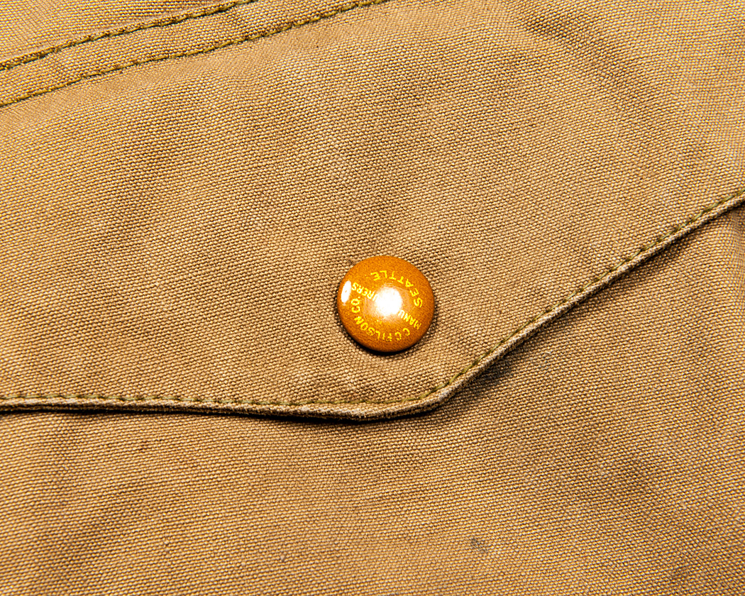 俗に「乳首」とも呼ばれる古いスナップボタン。おなじみ、FILSONのロゴがプリントされています。