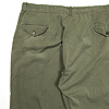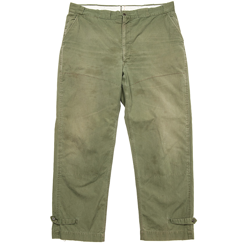今回紹介するトラウザーズは、カタログと少し裾のタブの形が違いますが仕様はほぼ同じ。だいぶ着こまれているので、各ステッチには激しい色落ち・縮みが出ています。フロントの当て布も止めていたステッチが飛んだようで、縫い直しがされています。