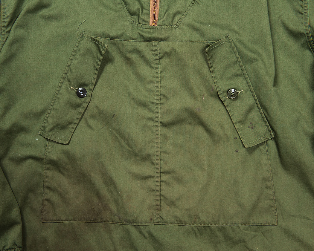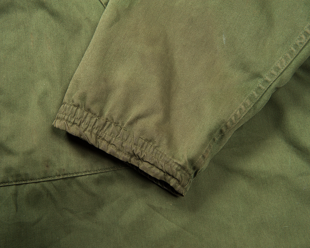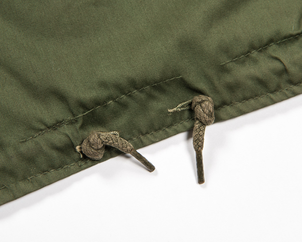 裾にもドローコードが。テープが入る道を作っているステッチが消えています。「切れた」というより「消えた」ように見えます。綿糸で縫っているため、経年変化で本当に擦り切れて劣化してしまったためです。