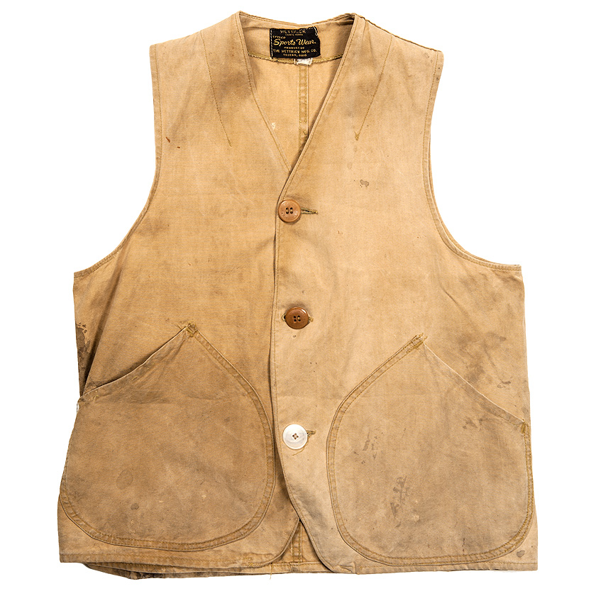 今回紹介するのは、おそらくアメリカンフィールドブランドより前に作られていたのであろう、Sports Wearというラベルのついたハンティングベスト。