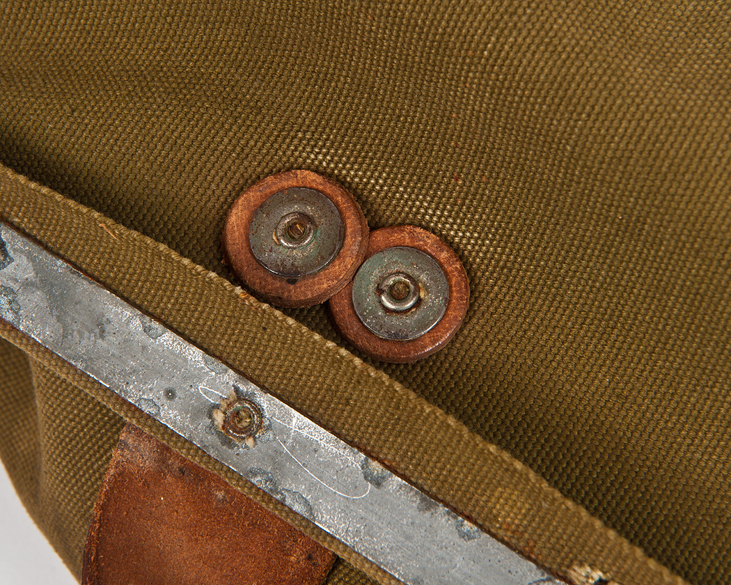 布1枚に打たれる部分には、革パッキンに金属ワッシャーまで入りかなり丁寧な始末。この革パッキンやワッシャーは、自動機で供給することはできないので、一枚・一枚打ってははめ、打ってははめ、していたはずです。これだけの個数を打つとなると、かなり手間のかかる作業です。