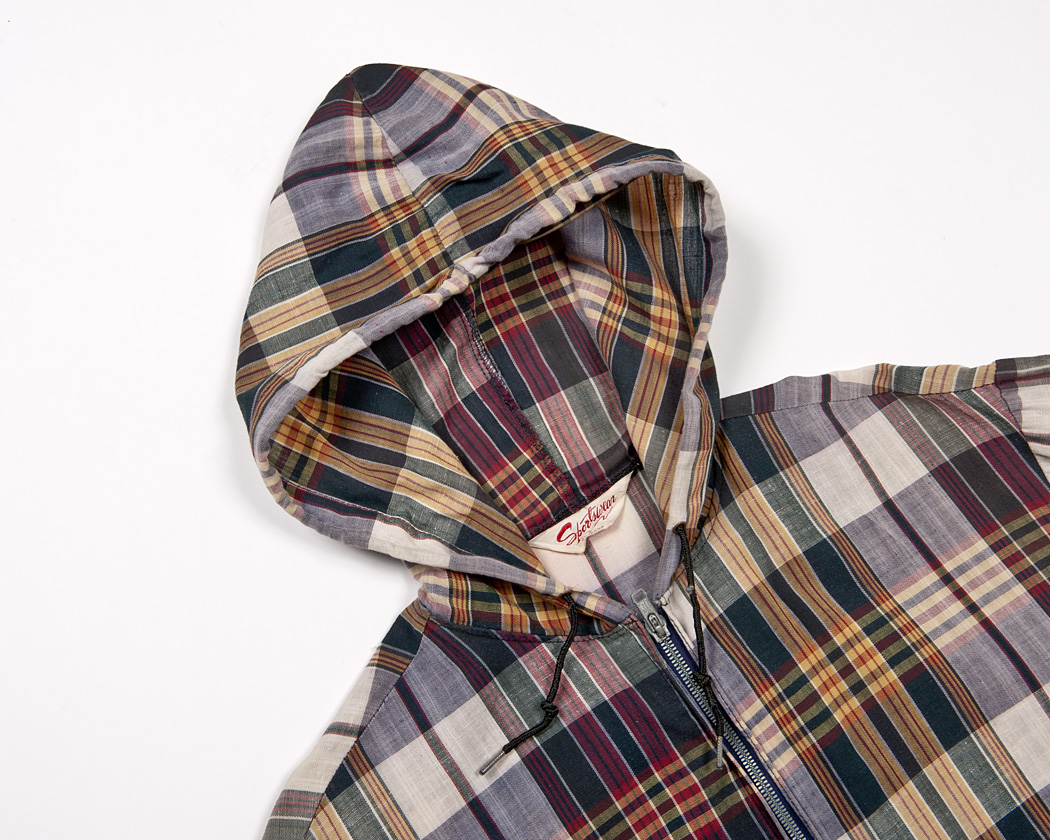 スピンドルの通ったフード。フードの中心や襟つけ、いたるところがロックで縫製されています。