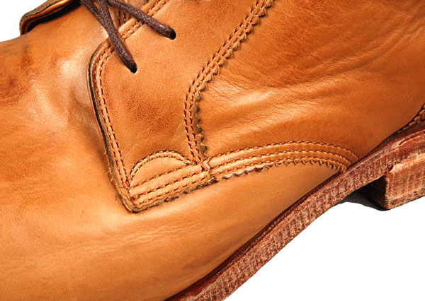 靴紐が通る穴は、ハトメなど無く、紐も細い丸紐が使われたりと、ここでもドレスシューズに近いディテールとの巧妙な掛け合わせが見られます。