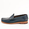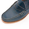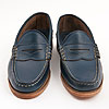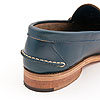 ネイビー色のホーウィン・クロームエクセルの革。レザーソールにトウ・ヒールは極太の糸でハンドステッチと、典型的なモカシンシューズです。