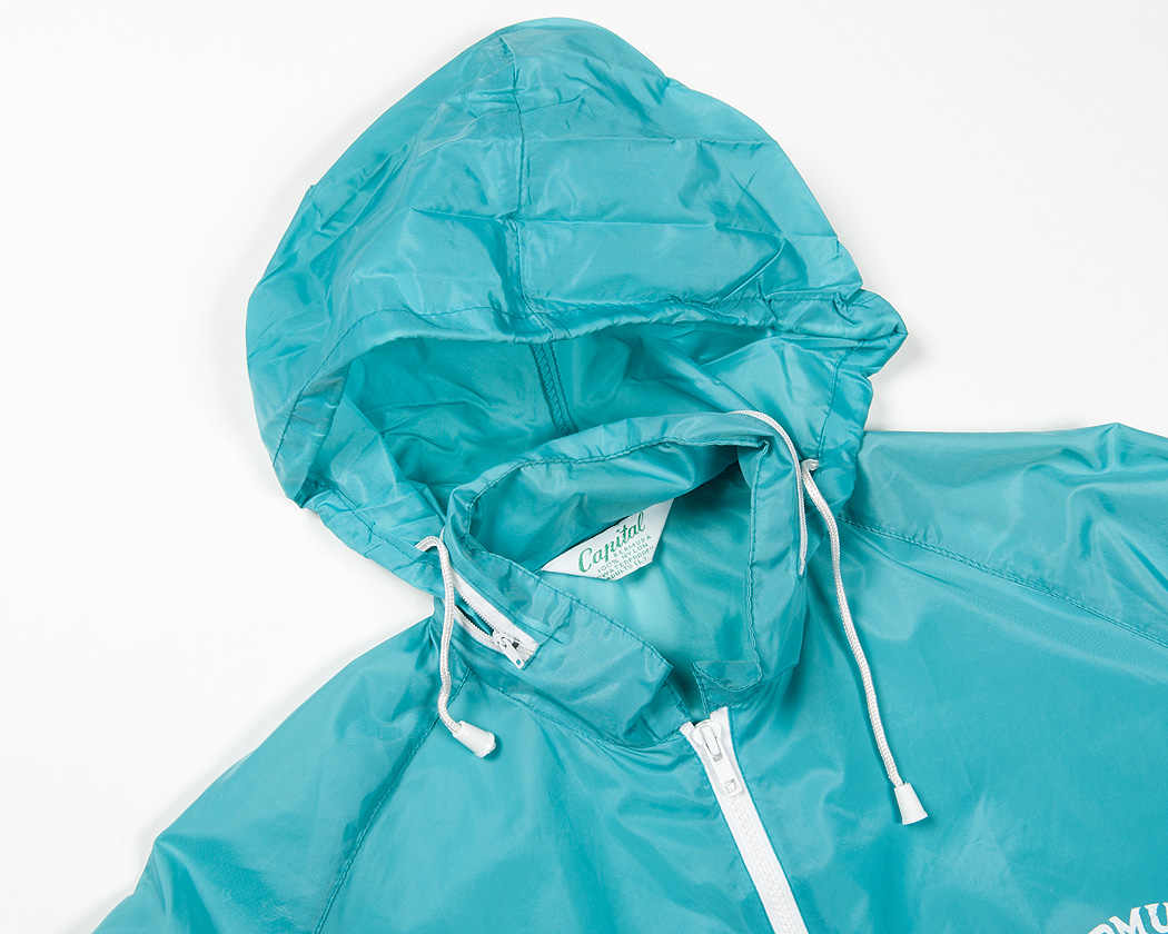 インターロックで縫われたフード。作りこそ簡単ですが、フード口を閉める紐があり、最低限の機能性は確保しています。