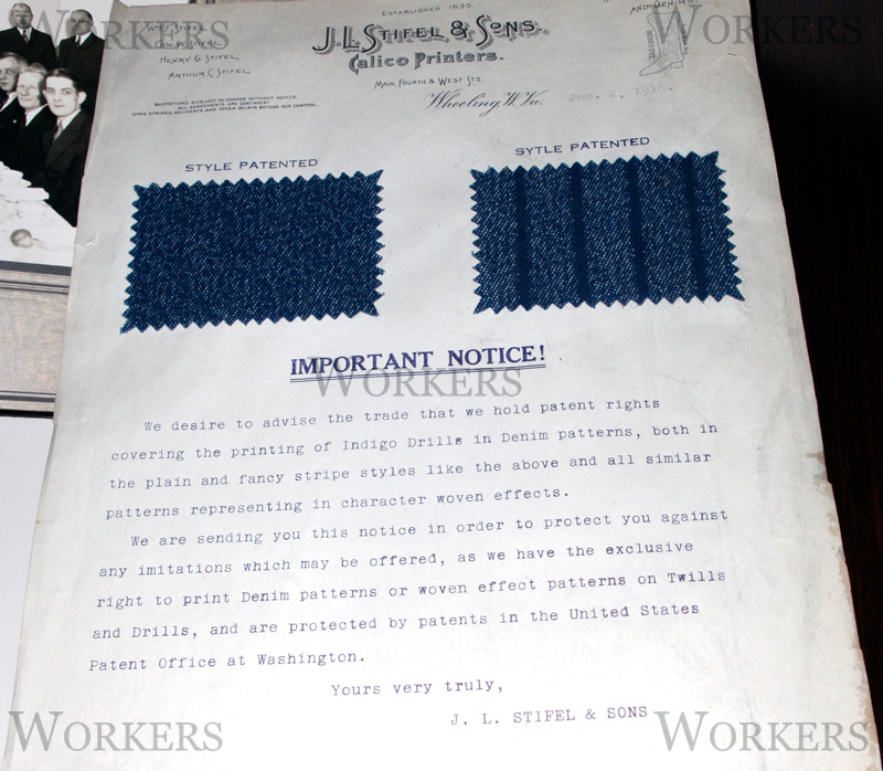 上の写真は1915年、Stifelがこのような製法で作られた生地は自社が特許を持っている、他社のイミテーションはNGであるという旨を送った手紙です。最初の子供たちが着ているのとほぼ同じ、綾織りのような柄が描かれた生地が張り付けられています。