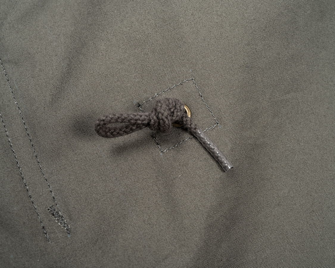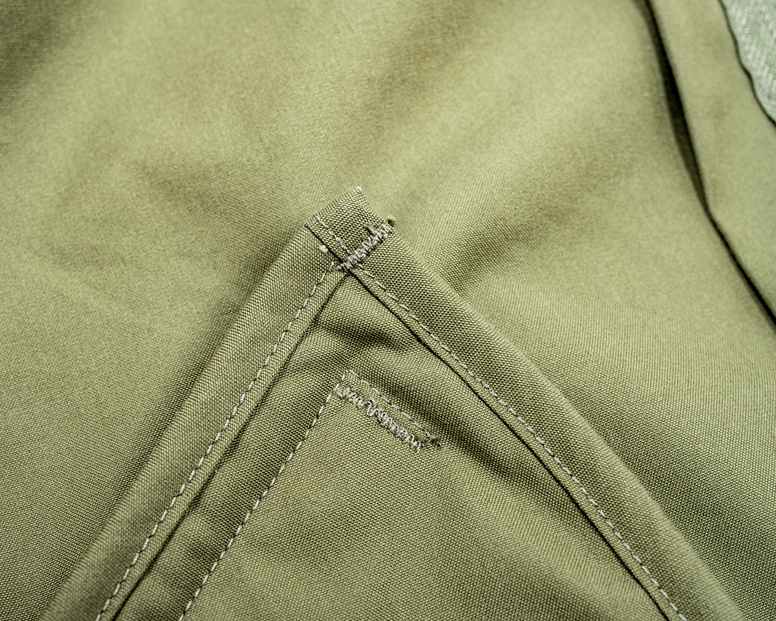 パイピングの最初・最後部分はカンヌキで補強。裏地が無い仕様なので袋布始末に手間がかかっています。