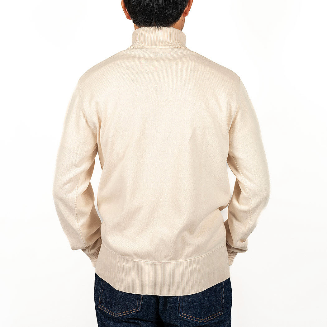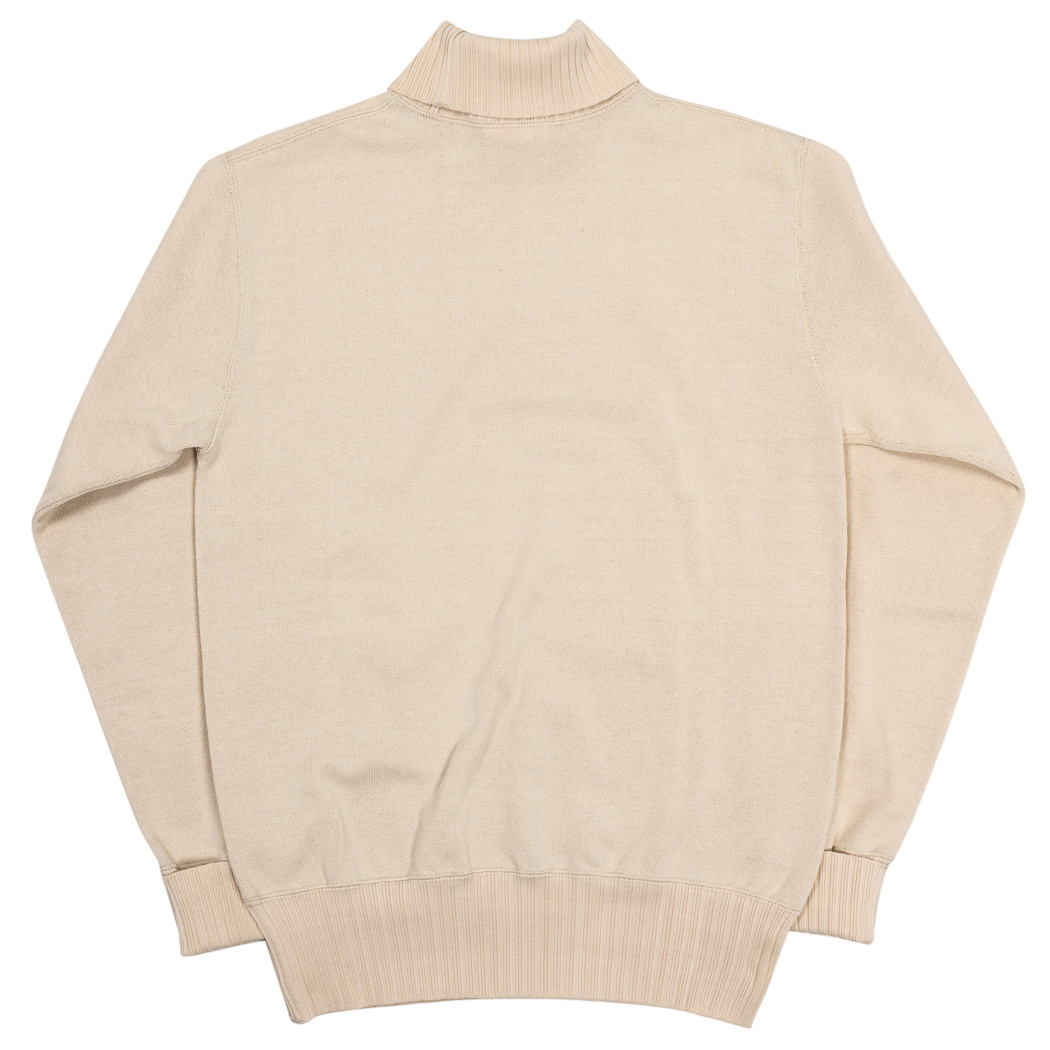 RAF Sweater、イメージは映画ダンケルグのRAF パイロットが着ていたハイネック。中はT シャツ一枚で着るとセーターの起毛面が肌に触れて気持ちいい。