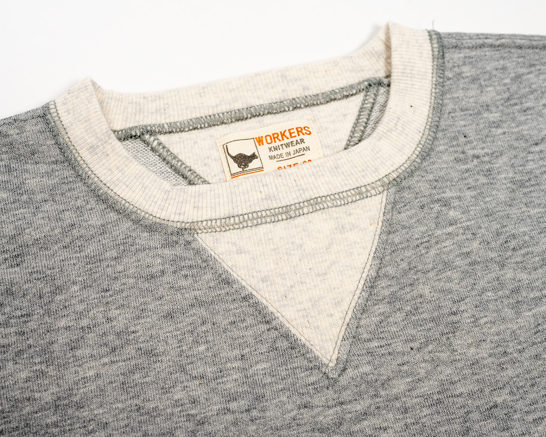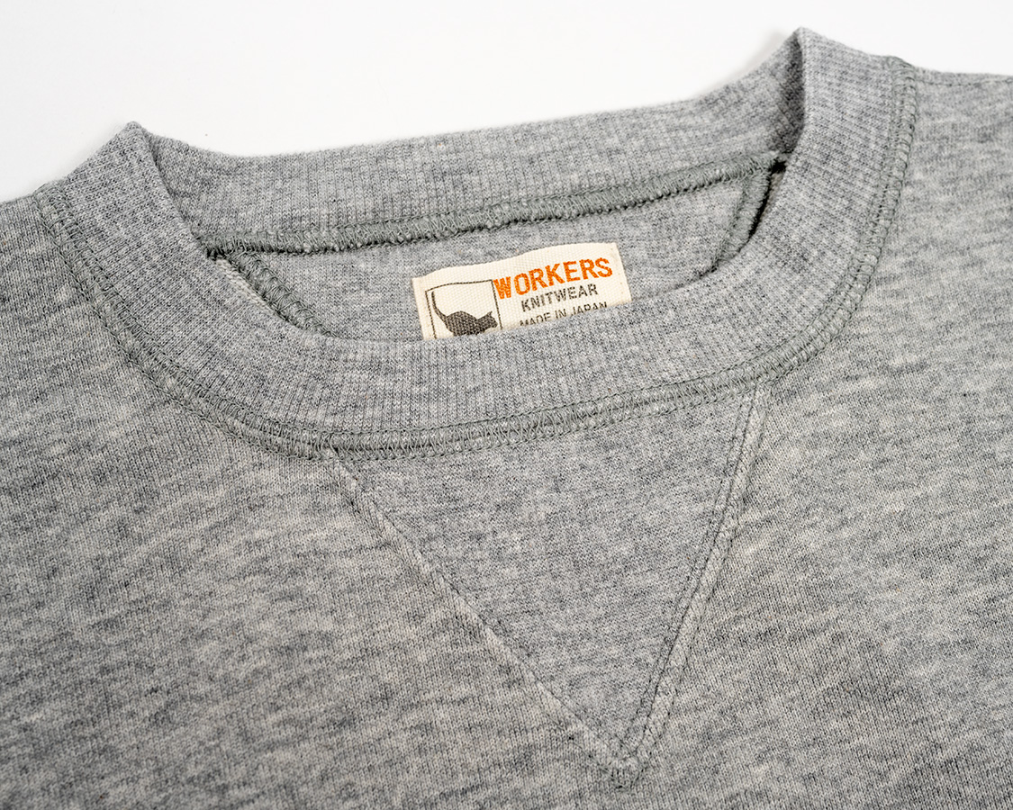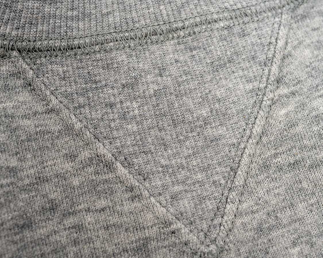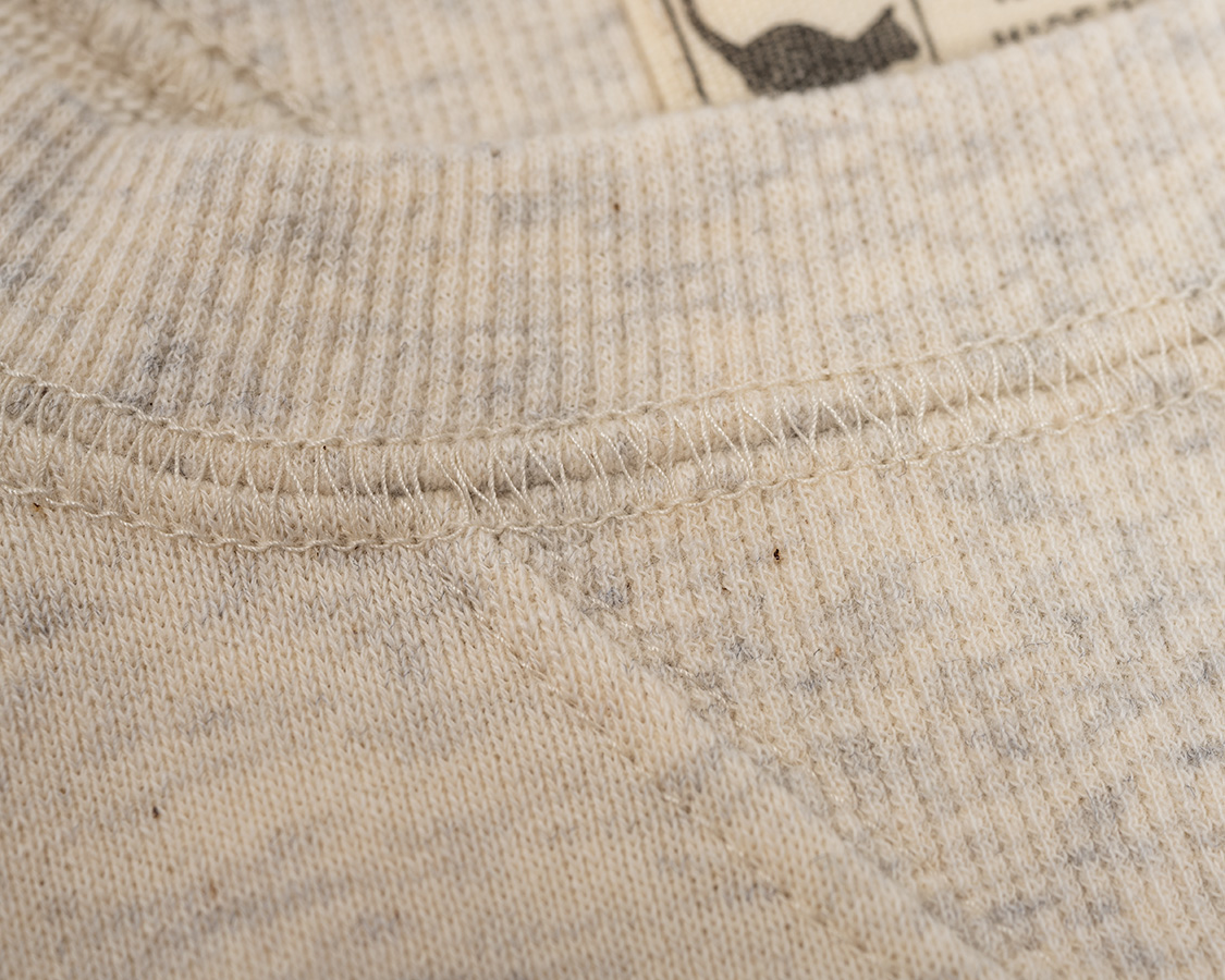 それに対し、首回りは表・裏ともにロック目の見える縫い方。 「両面振り」という縫い方。