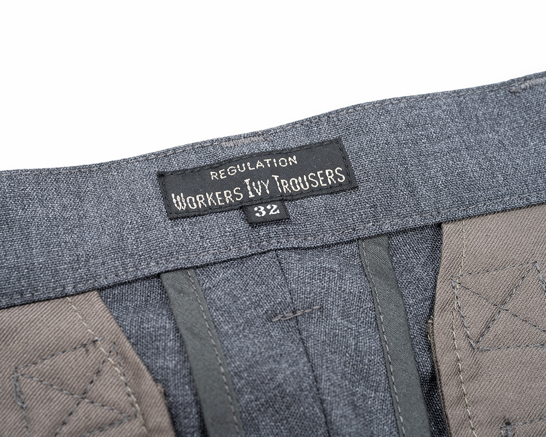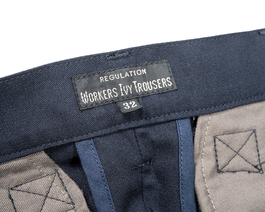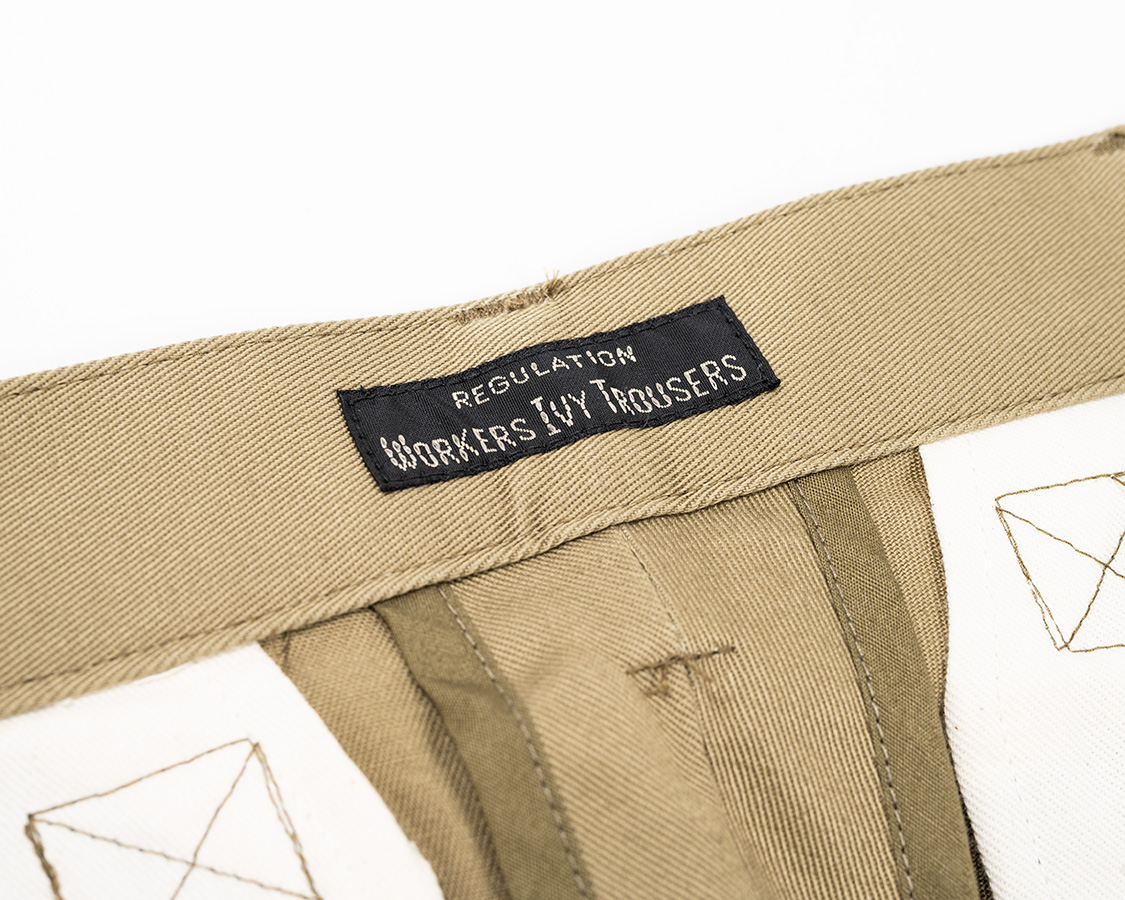 後ろ中心ネーム。IVY PANTSにしてしまおうかと思いましたが、一応ここはTROUSERSで。後ろ中心の割りもパイピング始末。