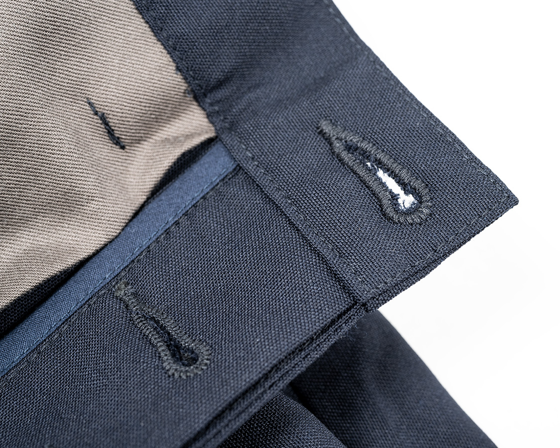 小股。開きどまりから下。ドレスウェア的にはステッチを入れない始末が多いのですが、あえてジーンズのようにダブルステッチ。強度優先です。