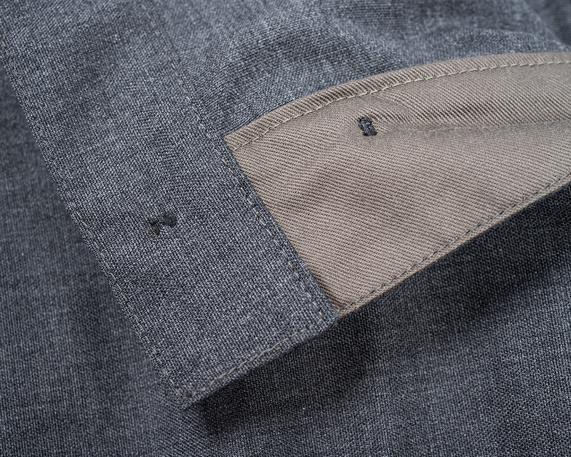 モチダシ、ボタンがつく側の端も身頃をモチダシでくわえ込む。ロックの見えない始末。