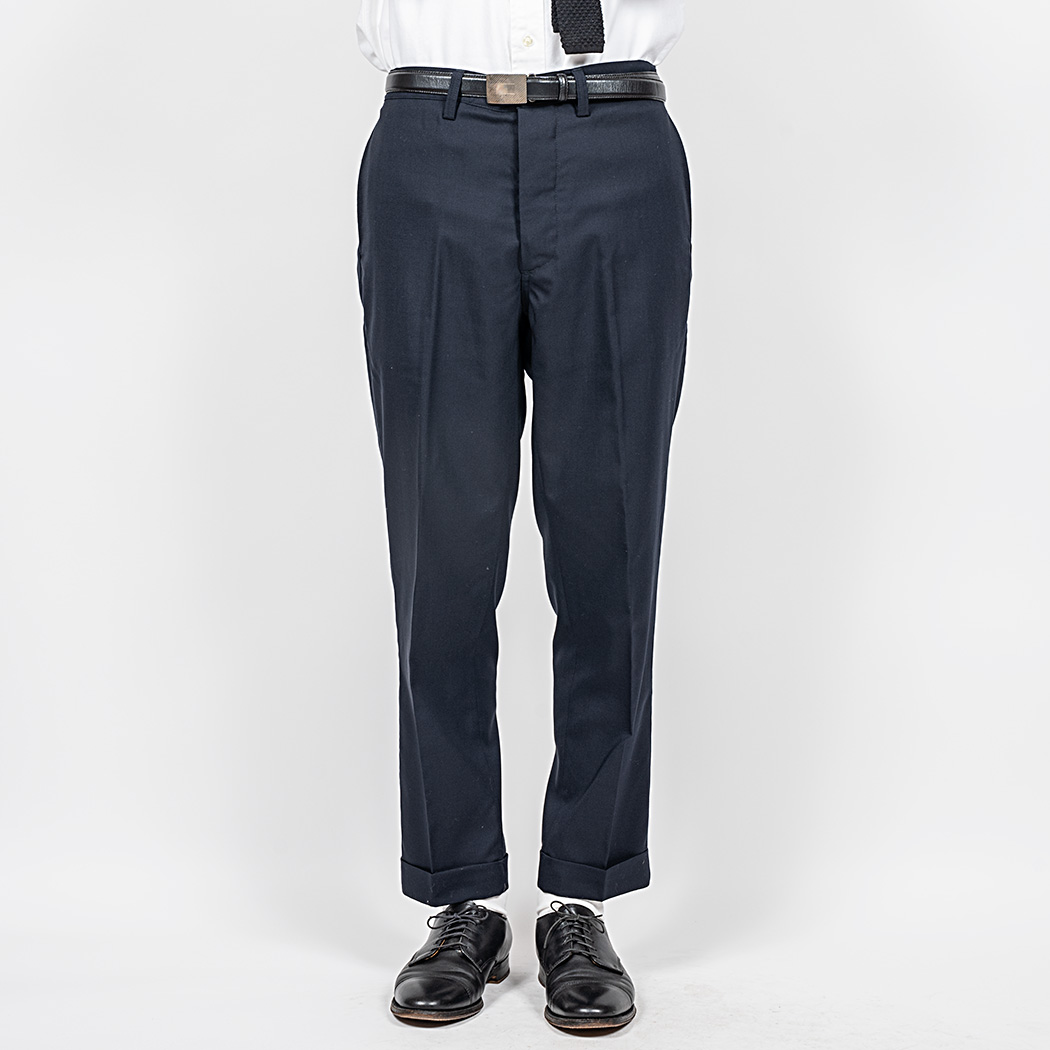 裾幅19 センチ程のやりすぎないスリムフィット。プレインフロント(前にタック無)、サイドの縫い目利用ポケット。バックシンチにフラップ付き玉縁ポケット。これでもかと「アイビー」らしい仕様を盛り込みました。