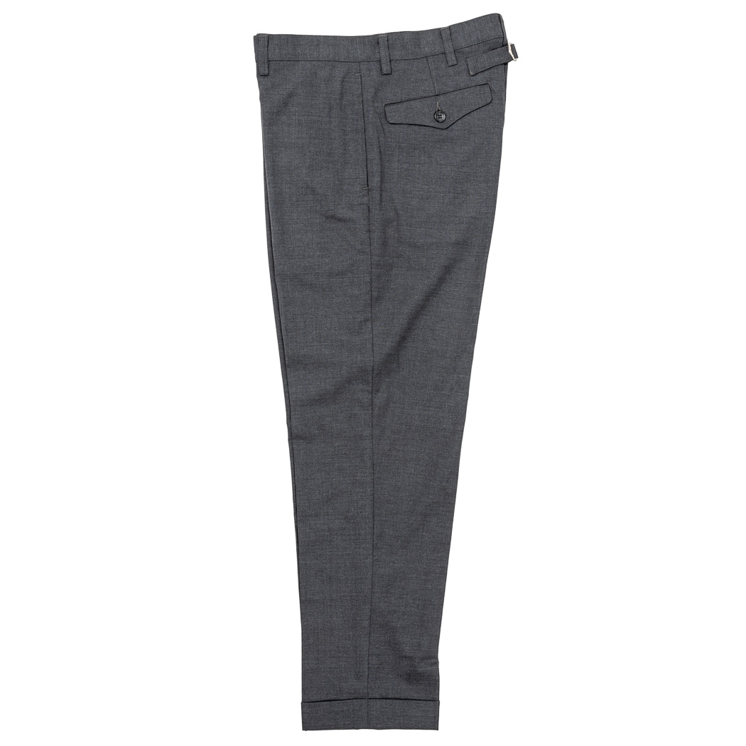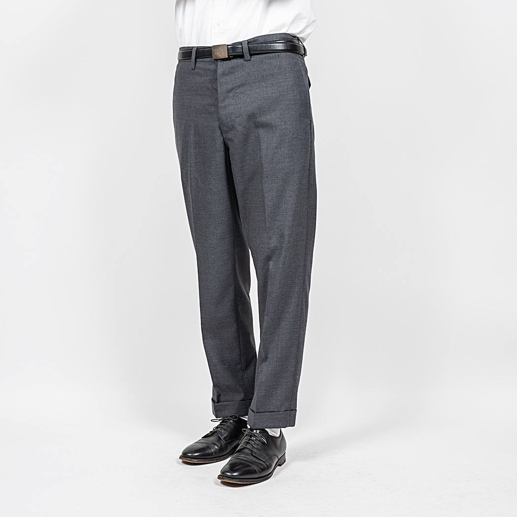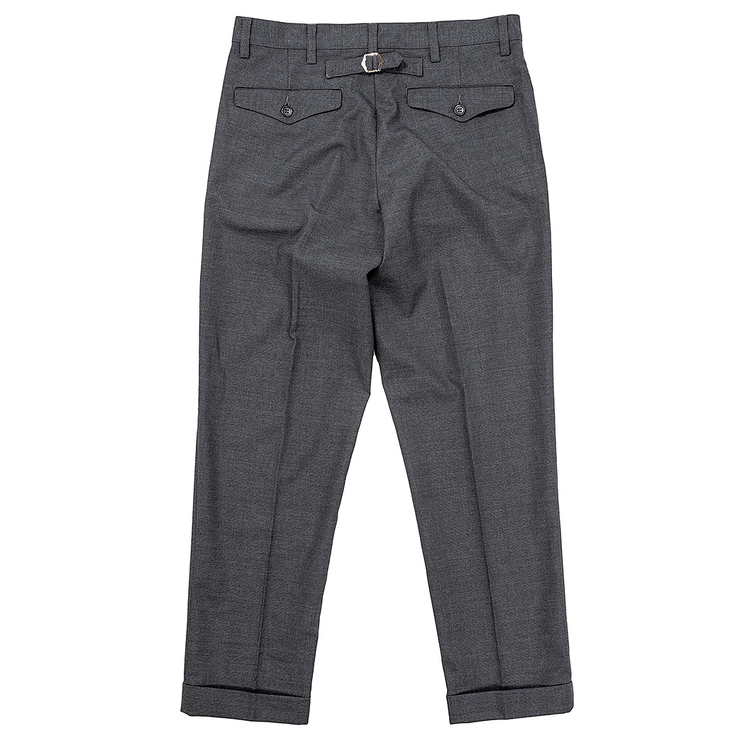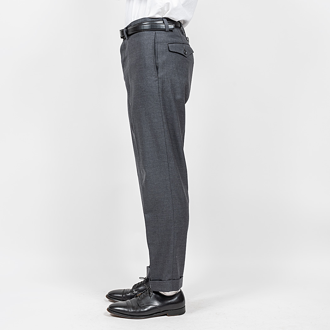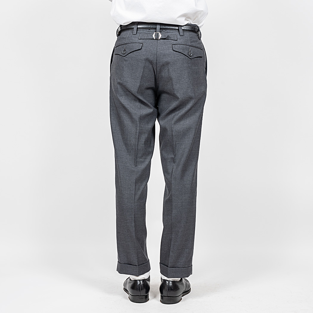 裾幅19 センチ程のやりすぎないスリムフィット。プレインフロント(前にタック無)、サイドの縫い目利用ポケット。バックシンチにフラップ付き玉縁ポケット。これでもかと「アイビー」らしい仕様を盛り込みました。