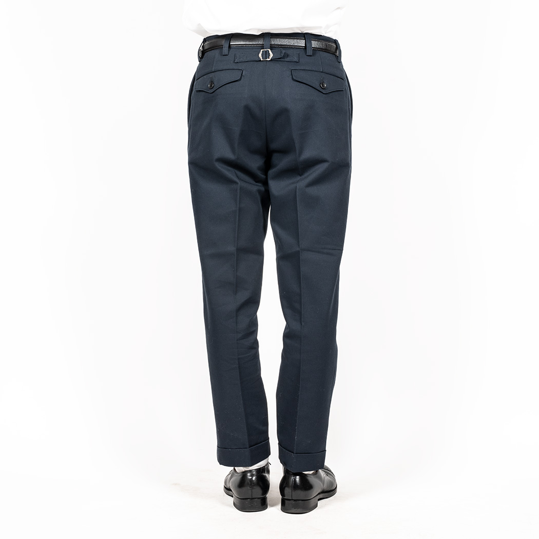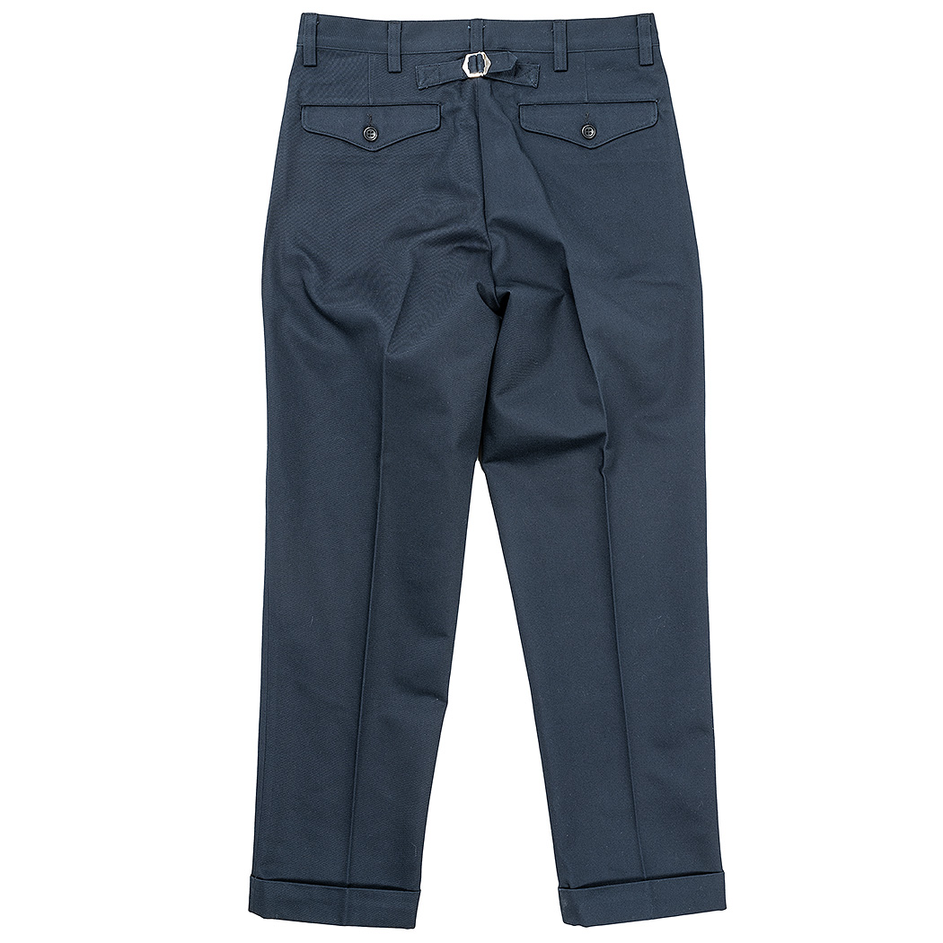 裾幅19 センチ程のやりすぎないスリムフィット。プレインフロント(前にタック無)、サイドの縫い目利用ポケット。バックシンチにフラップ付き玉縁ポケット。これでもかと「アイビー」らしい仕様を盛り込みました。