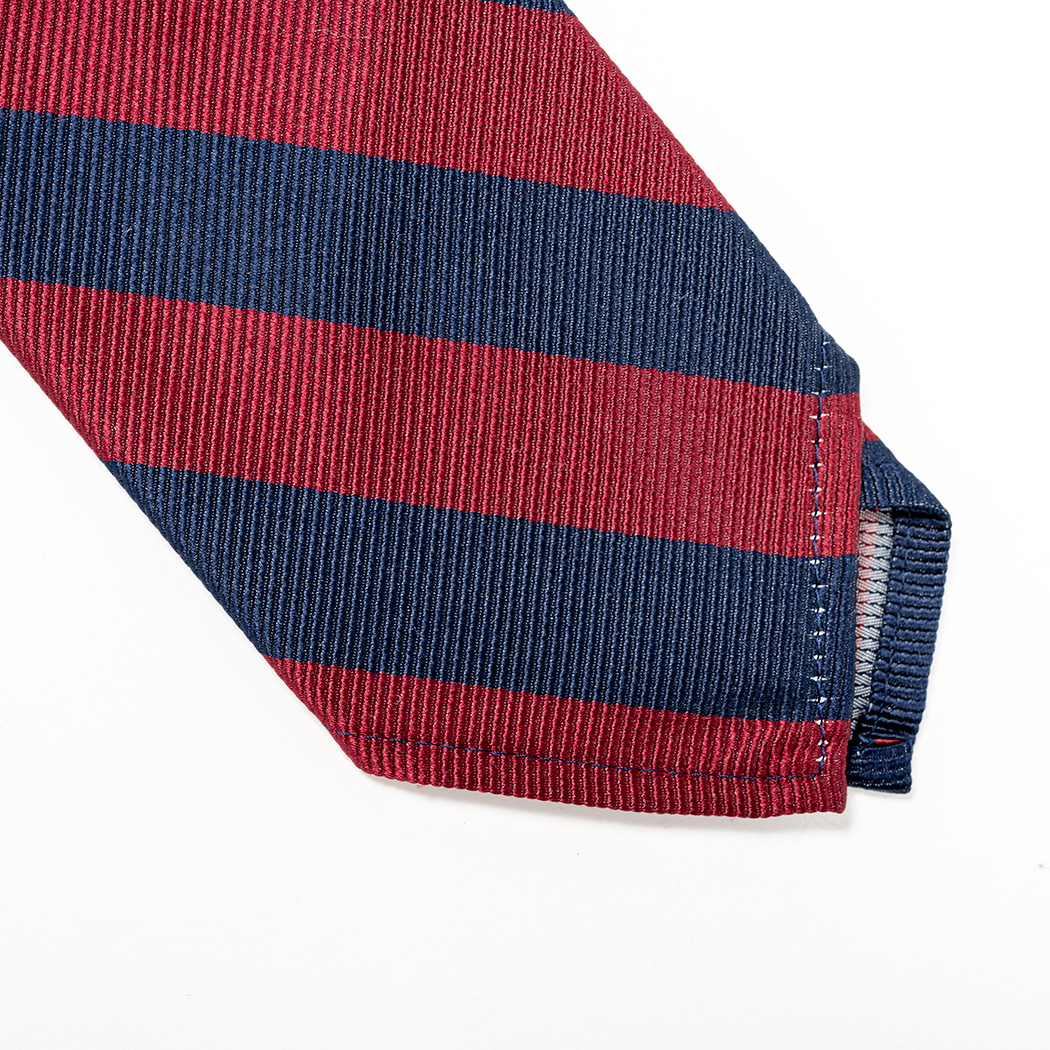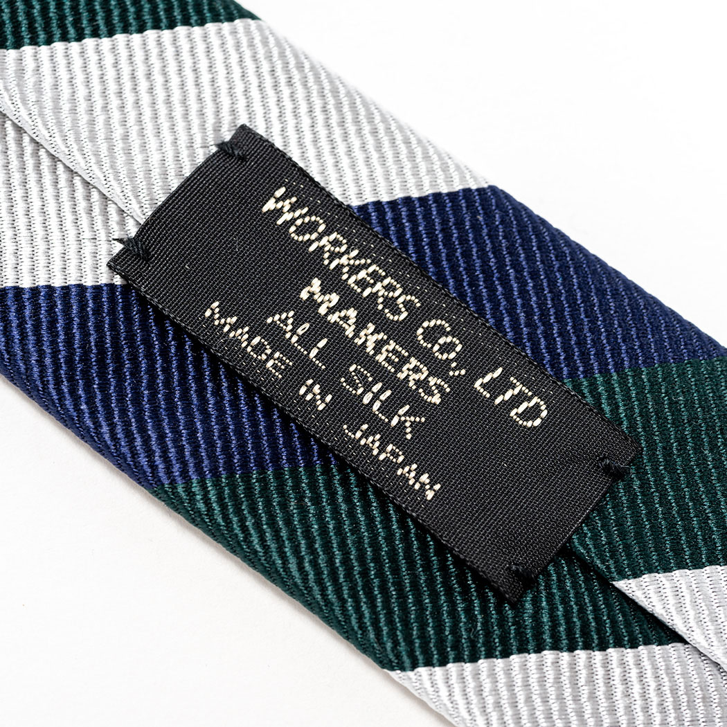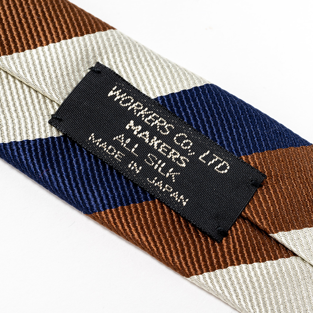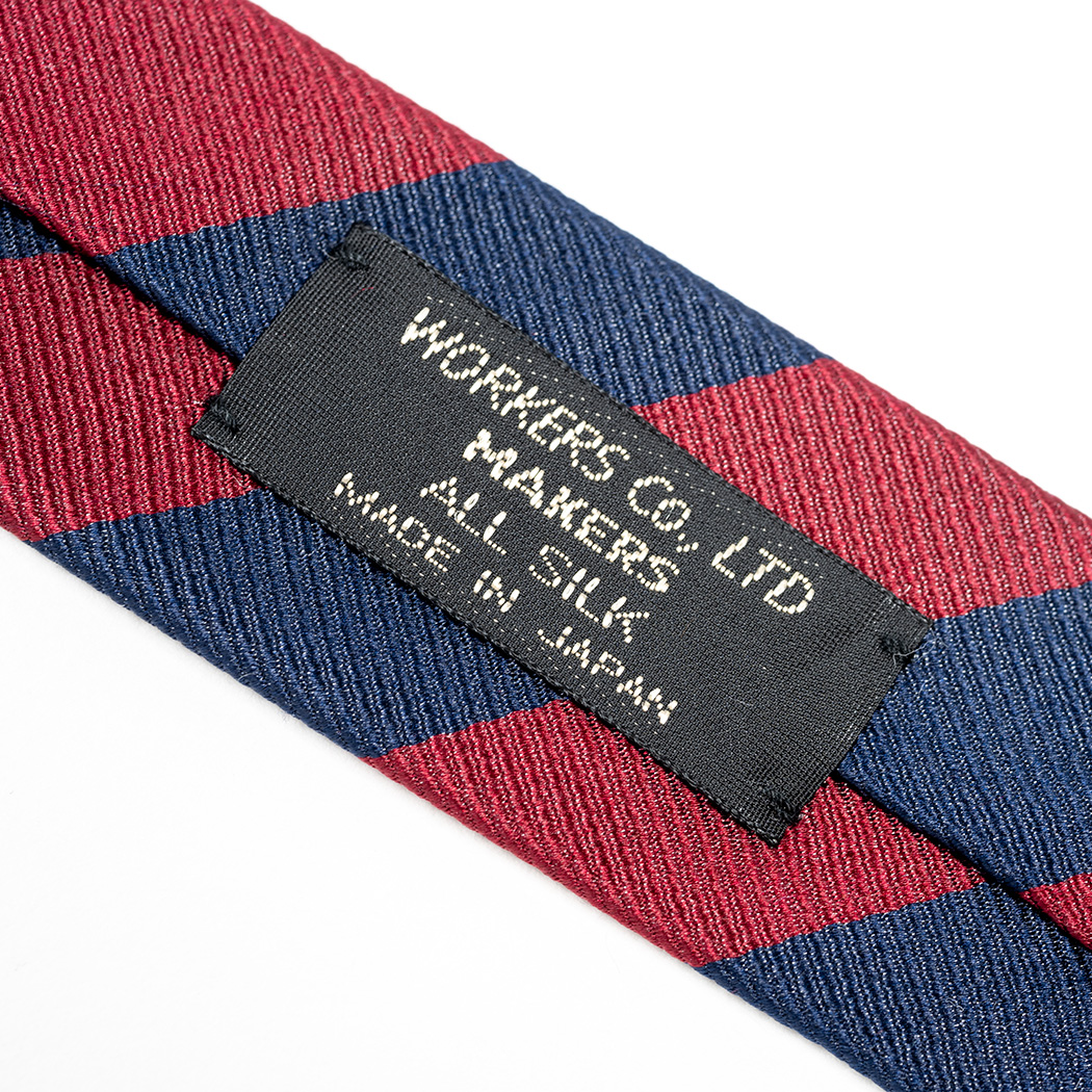 レジメンタルタイ、柄の流れはアメリカ式に左上から右下に流れるよう、裁断。 縫製はあえてミシンステッチで剣先を三つ巻き。剣先に裏地がつかない分、軽やか。芯も薄め、かつノットの部分を細い型紙。これが、WORKERSのネクタイ独特な「細いノット(結び目)」を生み出します。