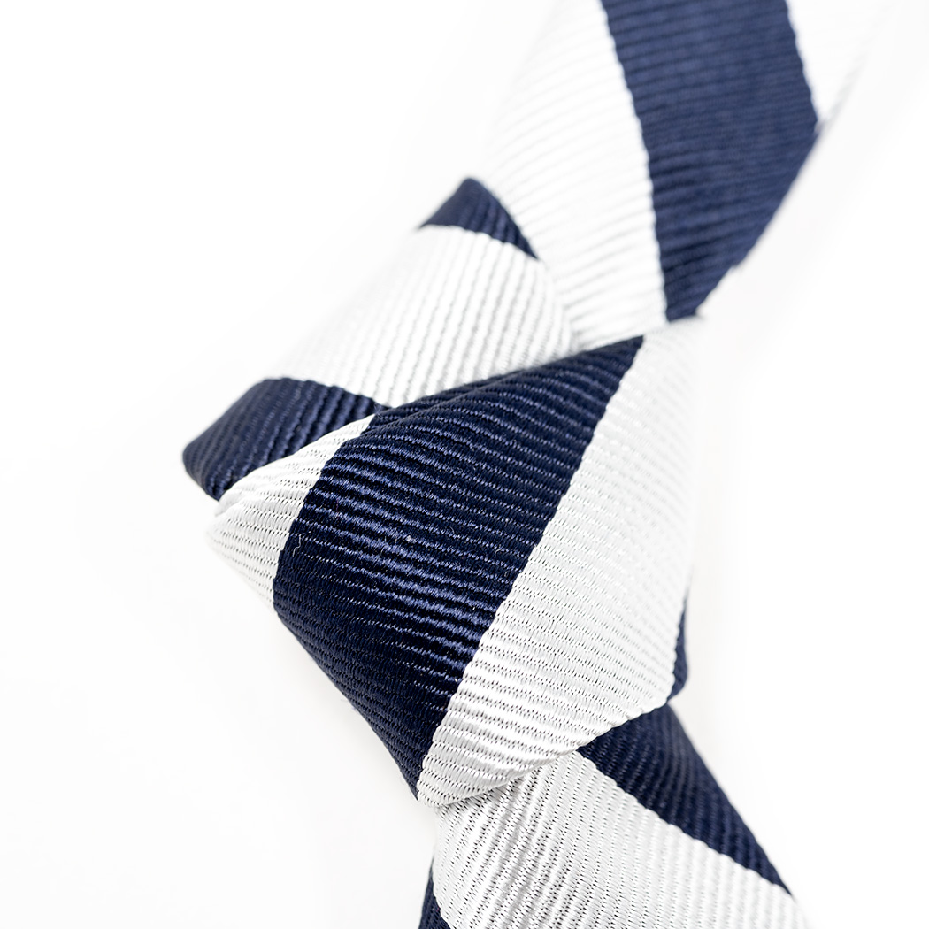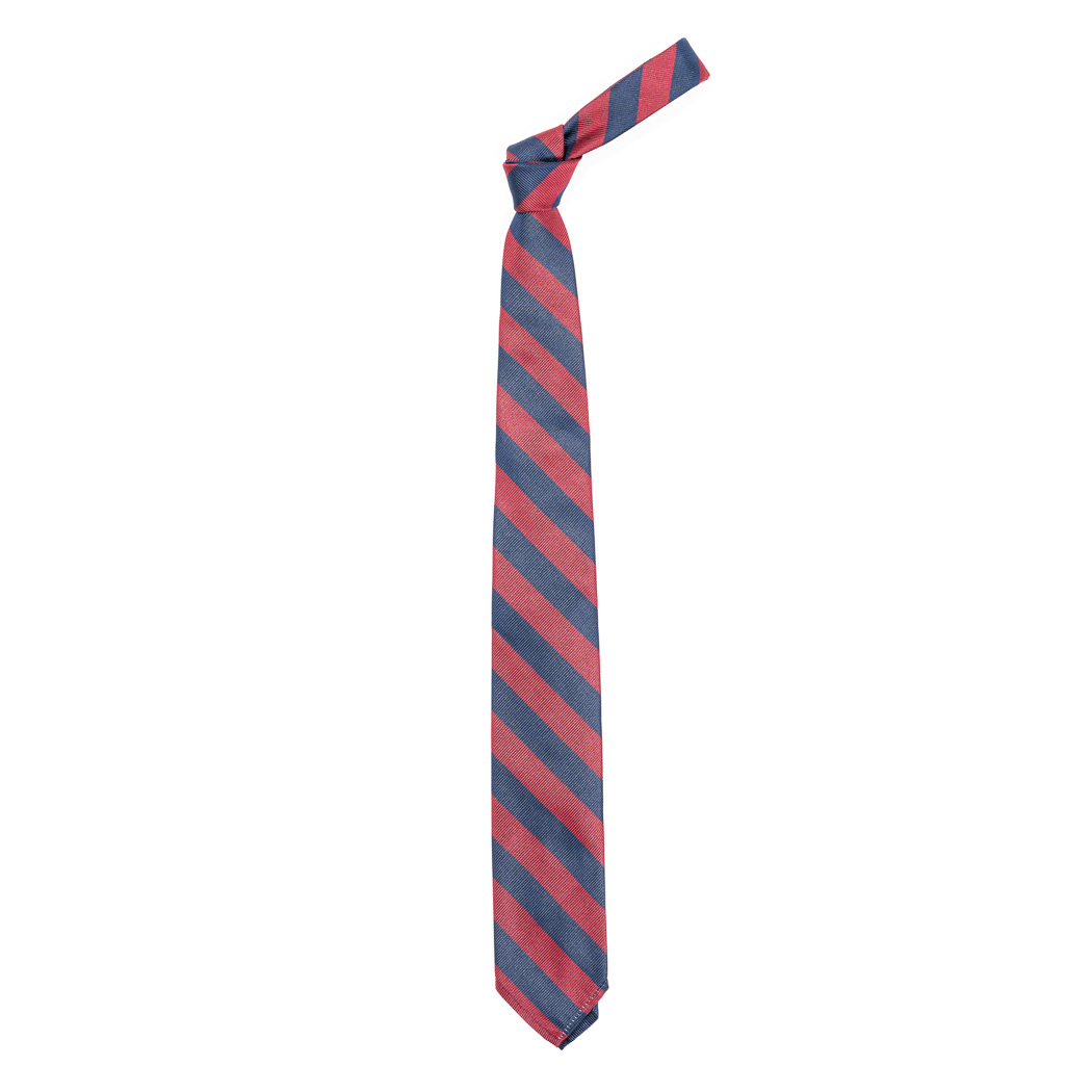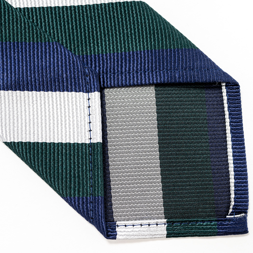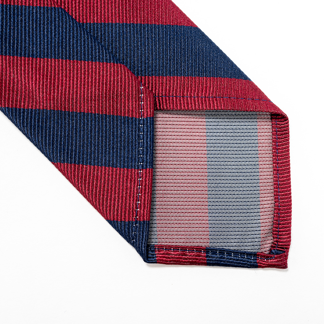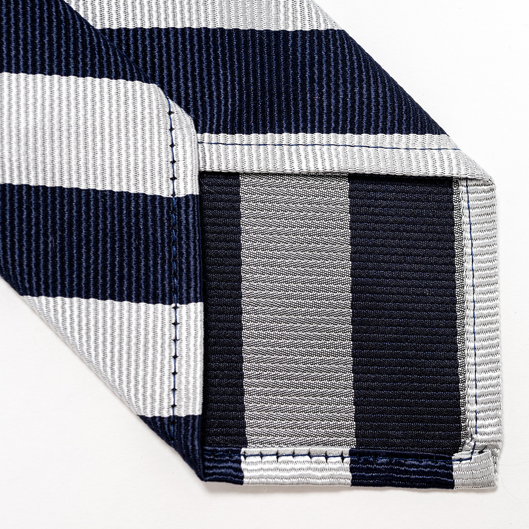 レジメンタルタイ、柄の流れはアメリカ式に左上から右下に流れるよう、裁断。 縫製はあえてミシンステッチで剣先を三つ巻き。剣先に裏地がつかない分、軽やか。芯も薄め、かつノットの部分を細い型紙。これが、WORKERSのネクタイ独特な「細いノット(結び目)」を生み出します。