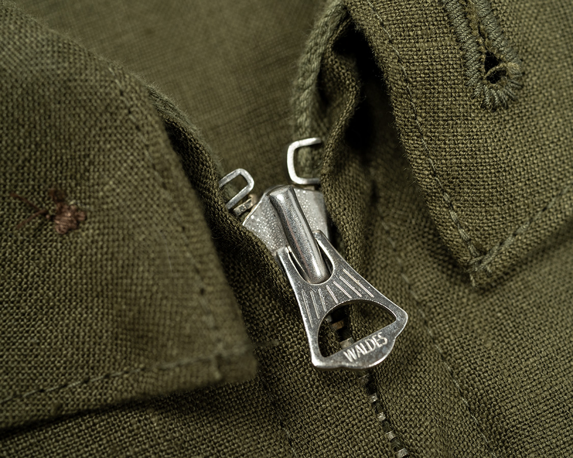 前ファスナーはWALDESのオートマチックロック。上端はコ型の止め。ちょっと古いTALON風の引手デザイン。