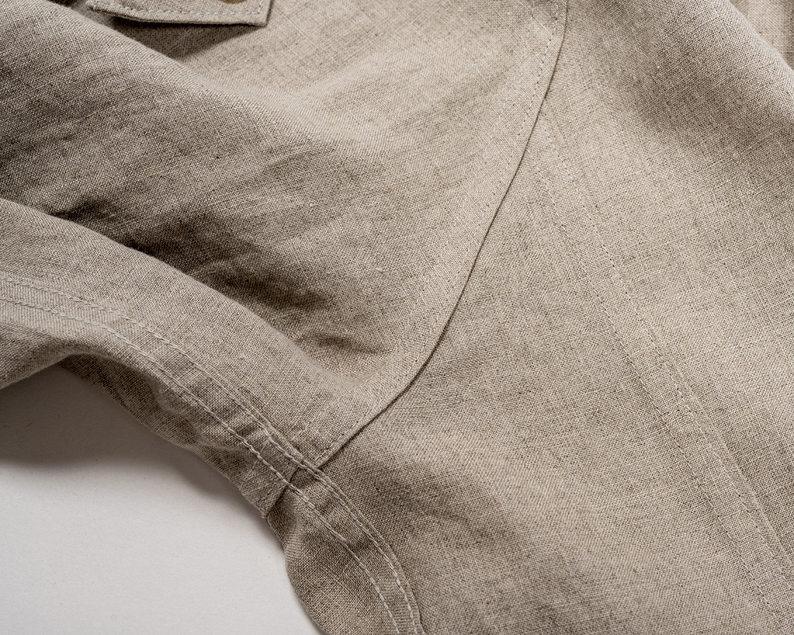 先ほどの袖の折伏せ縫い+脇の巻縫い。折伏せも巻きも、生地がお互いに噛み合いますが、巻縫いは金具+2本針ミシンで一気に縫います。筒状になる部分は、こちらの巻縫いで無いと非常に縫いづらい。でも、巻縫いはアイロンではなく金具一発で巻くから難しい。どちらの仕様も、それなりに手間や技術が要ります。