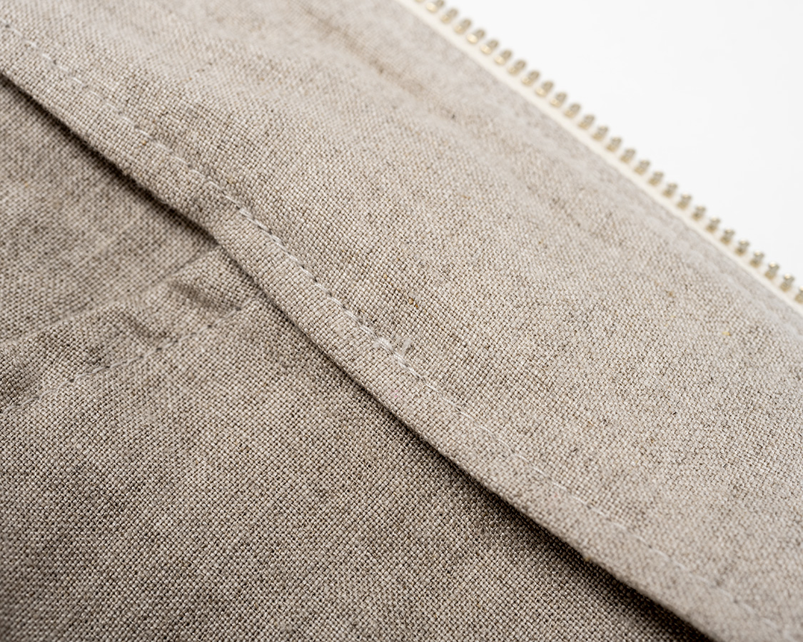 袋布の始末は周りを地縫い+返し始末。実は裏地有りより裏地無の方がこういった始末に手間がかかります。