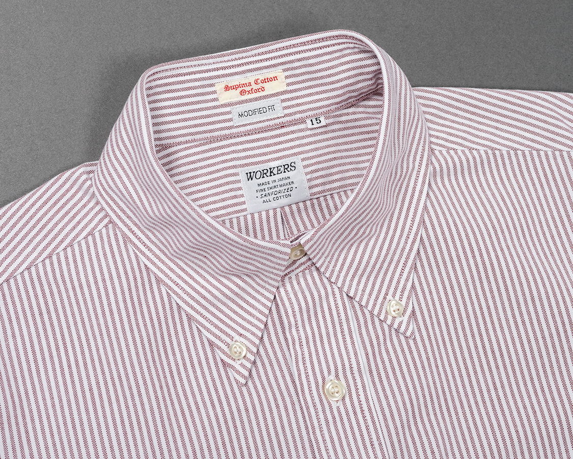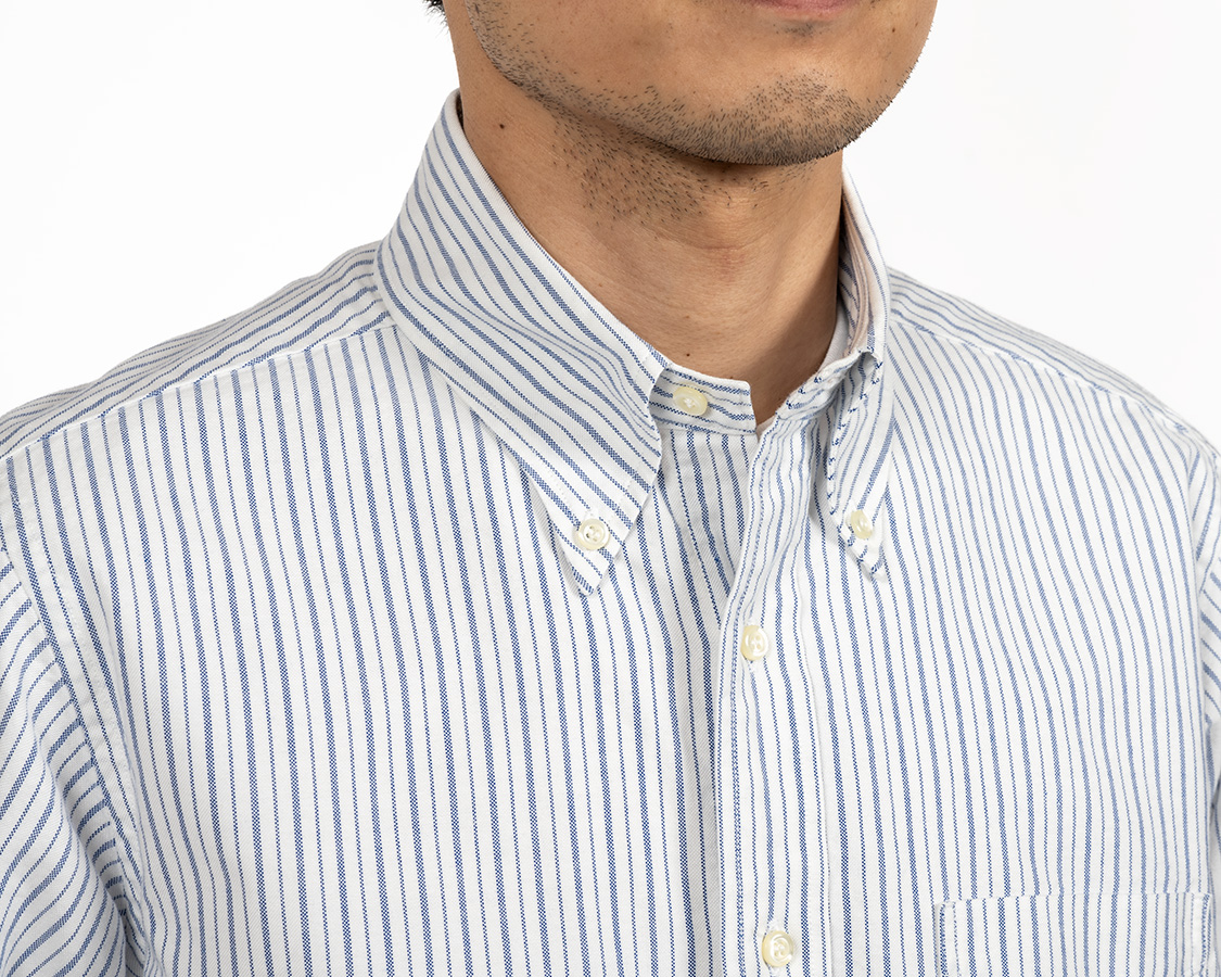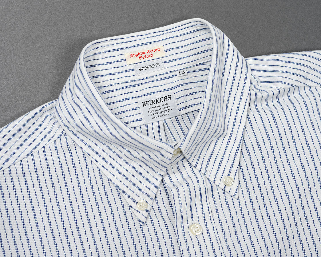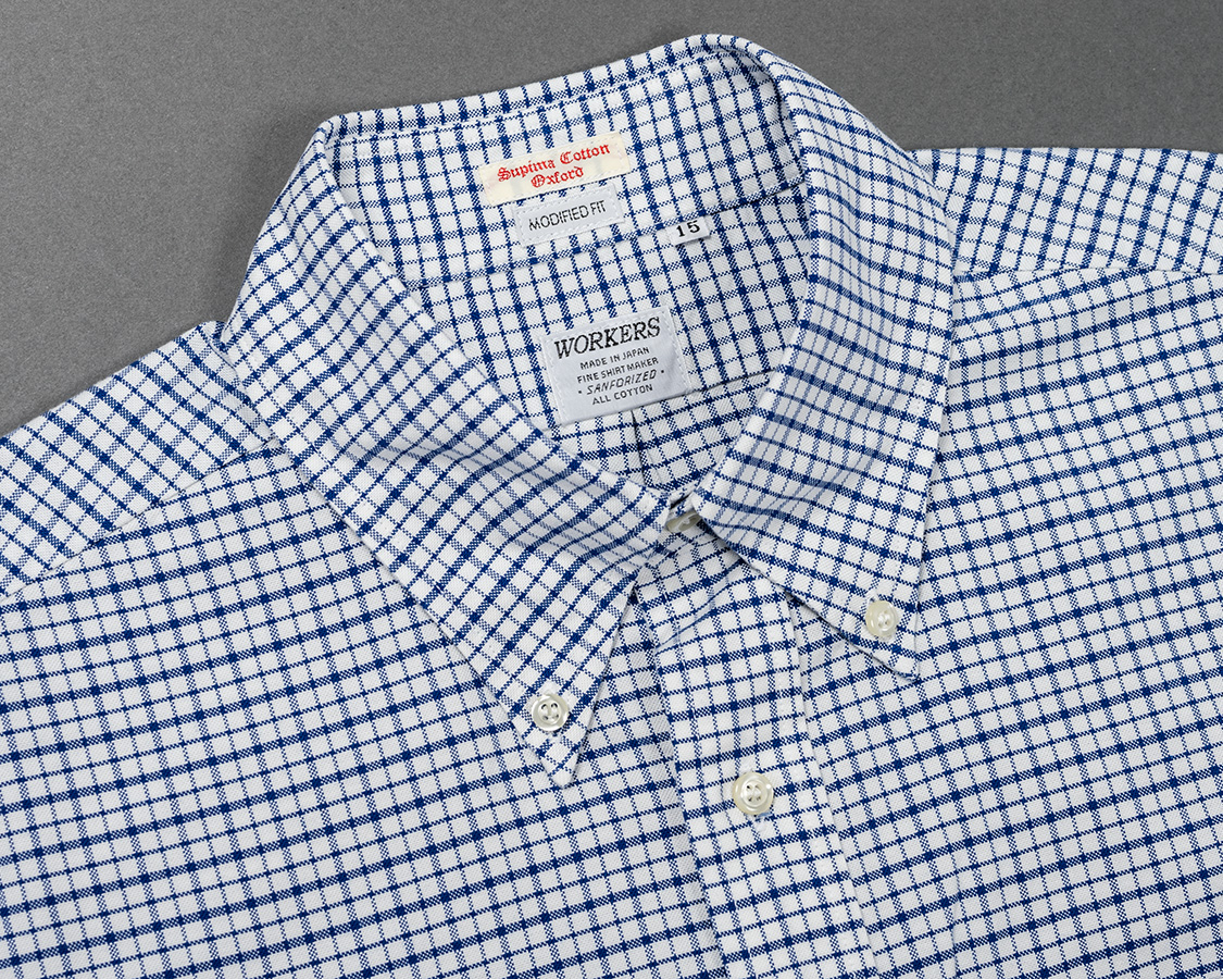 スーピマコットンの柄物オックス。不等ピッチのブルーストライプ、ブルーチェックはWORKERS別注。何か愛称を・・・という事で、我が家のマチちゃんの名前からMatilda Stripe、Matilda Checkと名付けました。