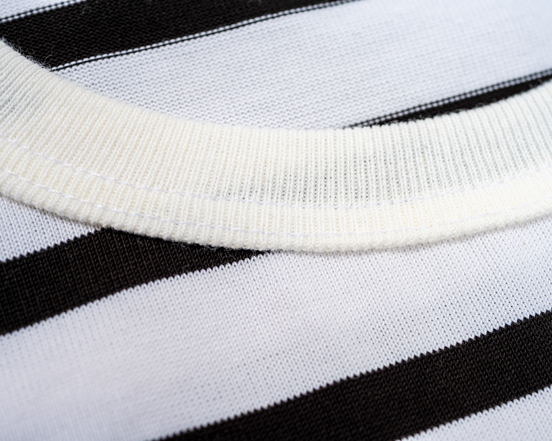 地味なこだわり、裾や袖口の折り返してロック目で縫っている部分。ここは折り返す前にも一度、生地1枚でロックをかけています。万が一、ステッチがはずれてもすぐに生地の端が出てこないので修理がとてもしやすい。持ちが違うので。