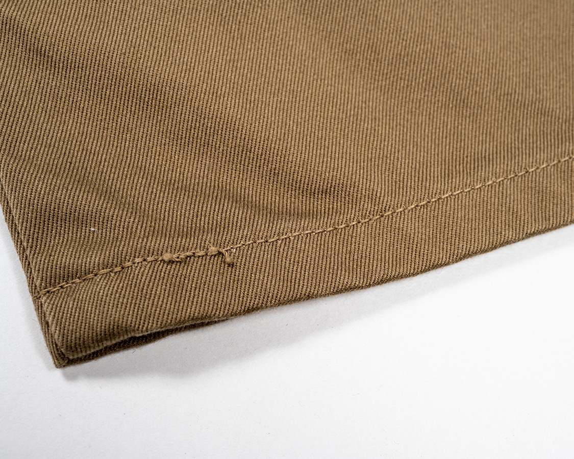 裾はあえての細い三巻。チノパンというと、太い折幅の三巻仕様が多いところ、ジーンズのように細めの三巻。