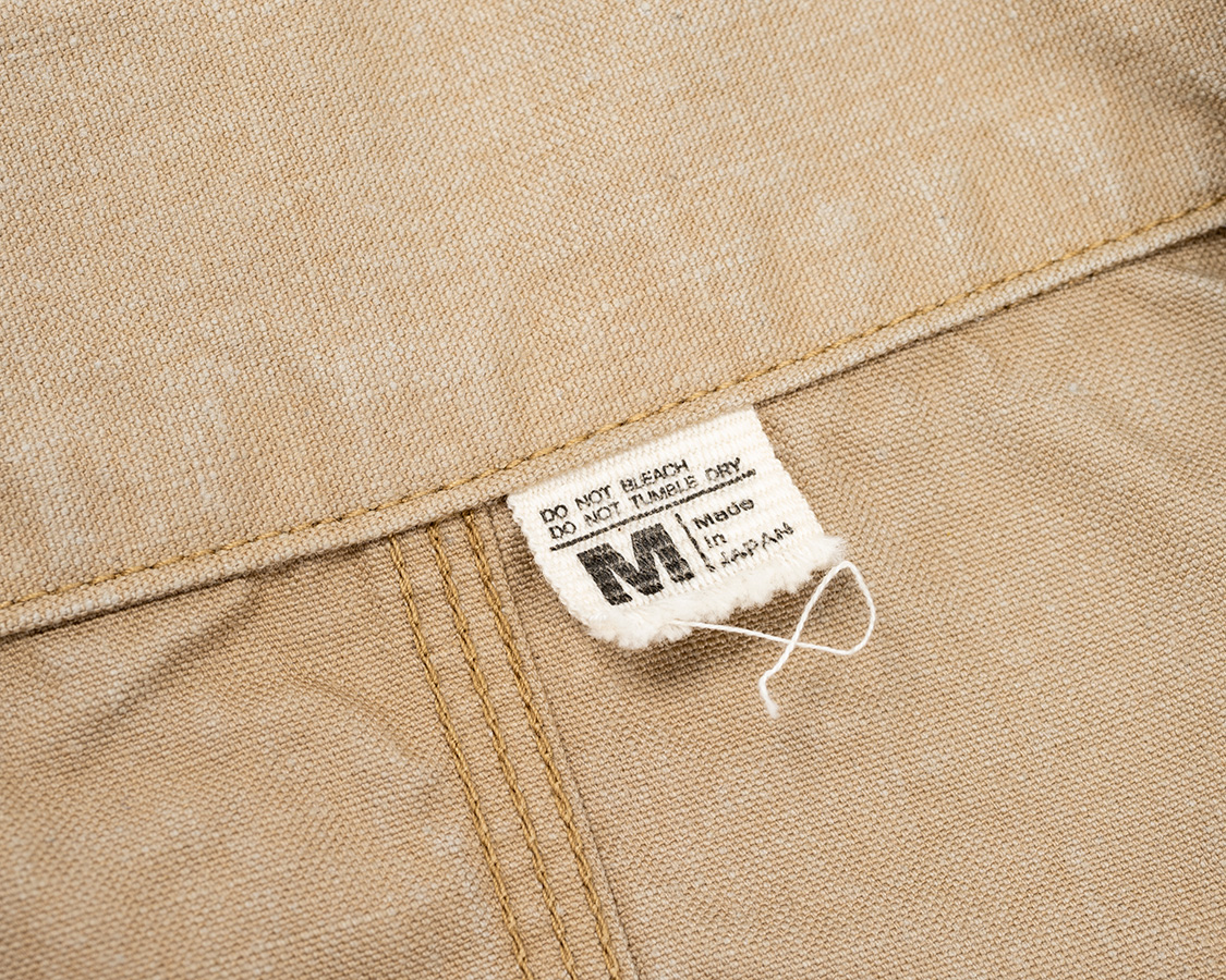 サイズネームも製品の雰囲気に合わせて。50-60年代っぽい、クラシックすぎないものを。下は断ち切りなので徐々にほつれて最後は経糸(たて糸)だけが残ります。