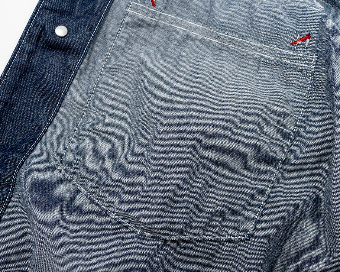 袖ぐり部分。袖同士のトリプルステッチ、身頃と袖のステッチと、これでもかとステッチが並ぶ部分。いかにも「ワークウェア」的な仕様。