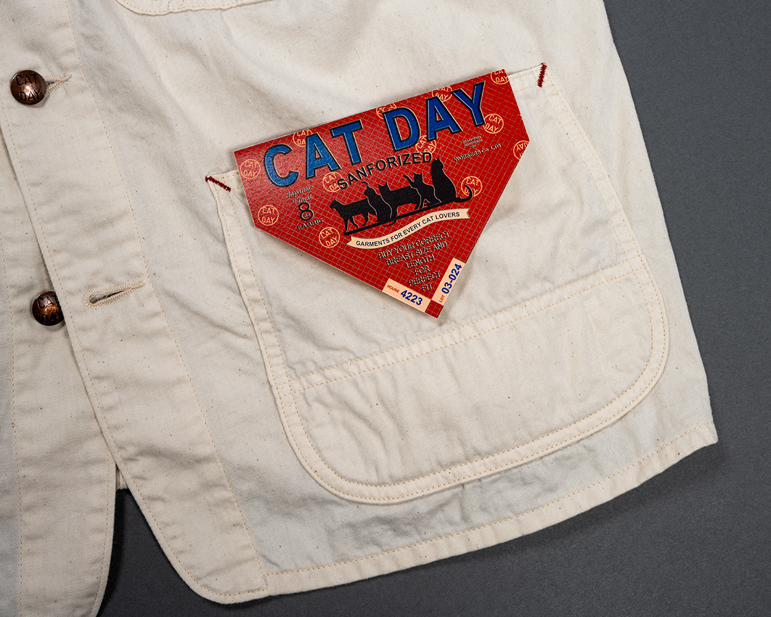 腰ポケットには補強当て布付き。フラッシャーのデザインが一番大変でした。全ての猫好きに送るカバーオールです。