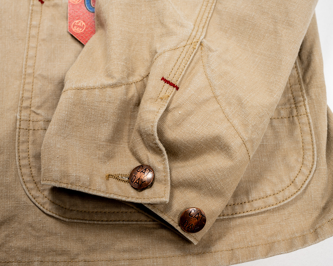 ワンウォッシュでボタン表面のメッキが少し落ちて良い雰囲気になっています。「永遠に綺麗なまま」ではなく、使い込むごとに良い雰囲気にやれて行く。そんなボタンを目指して墨入れ無しにしたのですが、結局、墨も欲しくなり自分でペンで入れています。墨入れも落ちすぎず、かつ、微妙にハンドメイドなのでにじんでいて良い雰囲気です。