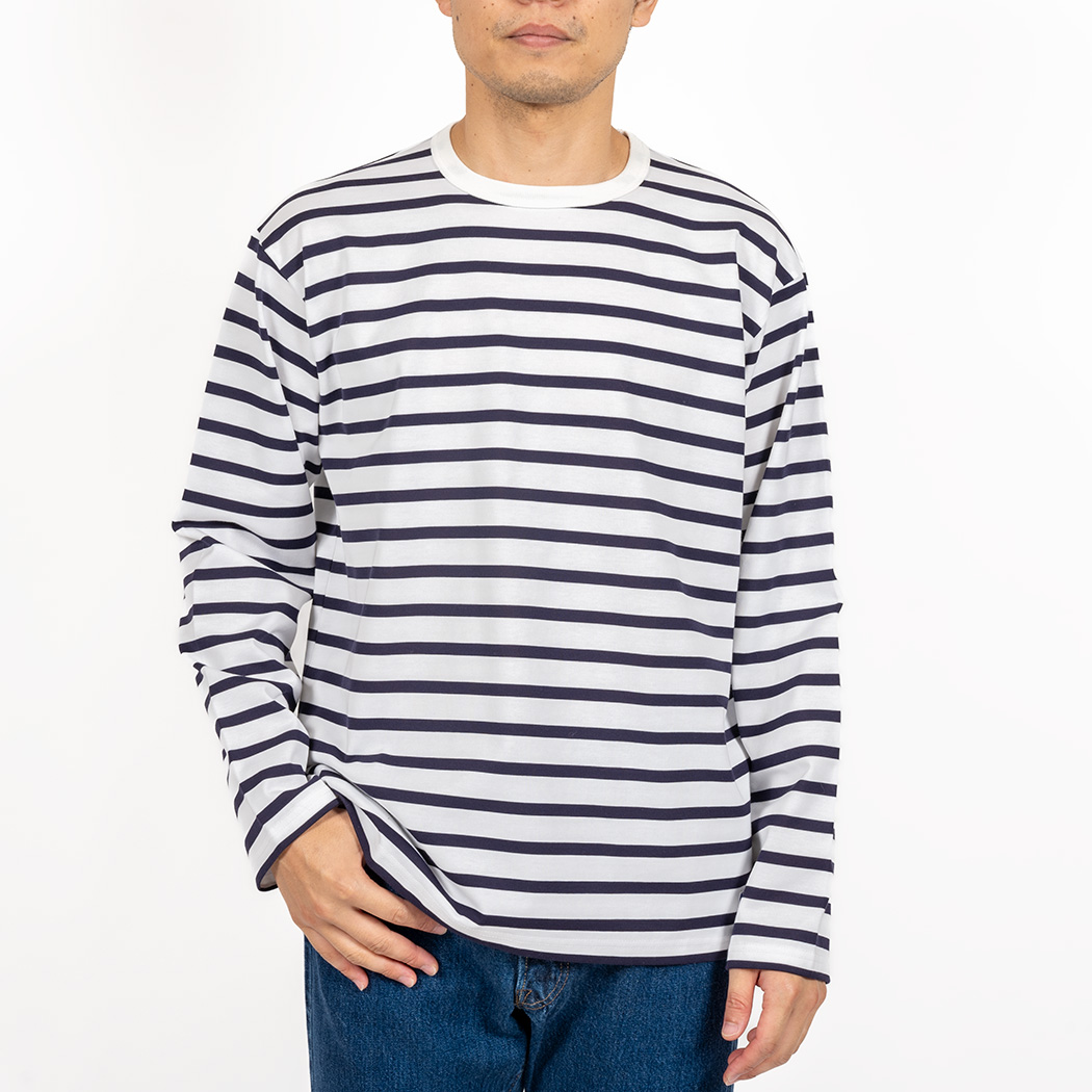 編み上がった生地をシルケット加工。アルカリ性の液体につけて表面をつるっとさせる。がっ しりして形崩れしづらい、かつ表面はつるっとしているので上にジャケットを着ても引っかからない。首のリブはがっしり厚い物にして、ボーダーの色部分が透けづらいように。