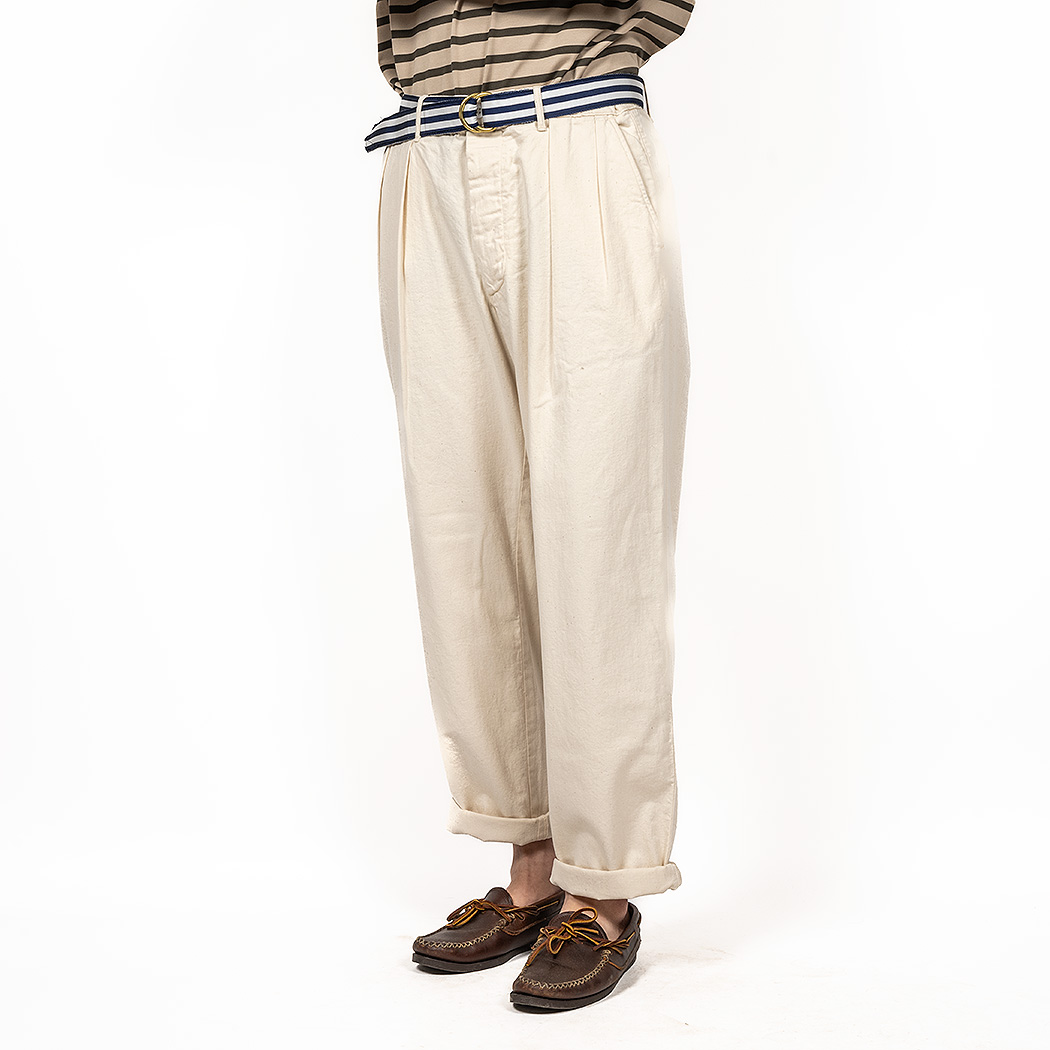 80-90年代っぽいので、ある意味合わせ方はなんでもOK。しっかりシャツをタックインして、上にネイビーブレザーでトラッドっぽく着るもよし。カットソー合わせてもっとラフも良し。ゆったりしたシャツの裾を出して着るもよし。「なんでもあり」だった時代のトラウザーズをモデルにしているので、合わせが楽です。