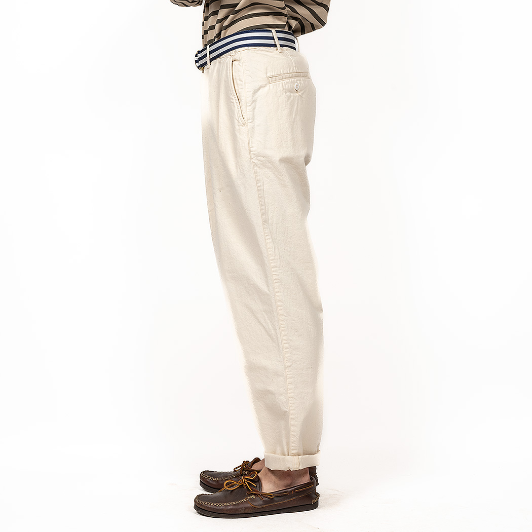 腰回り・ヒップにゆとりがあるので動きやすい。裾はあえてジーンズのような1センチ程度の幅の三巻始末。腰のタック見ると、古いミリタリーのチノパン あたりをモデルにしているのかな?とは思いますが。全体の仕様は80-90年代的な簡素で強度はしっかりあるもの。この「レプリカとも違う」「80年代、ぎりぎりMade in USAでやれる範囲」の仕様を再現しています。