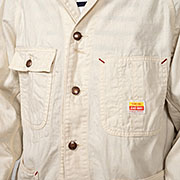 デザインの参考はJ.C.Penney系のあれです。オリジナルをいくつか持っていたので着てみたり、パターンを取ろうかとしたのですが・・・オリジナルはシルエットの癖が強い。肩がボコっと出てイビツ。だったらと、WORKERS オリジナルの2 ピース袖パターンで。ポケット、袖口、襟といった部分はオリジナルを参考にしています。