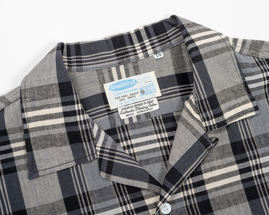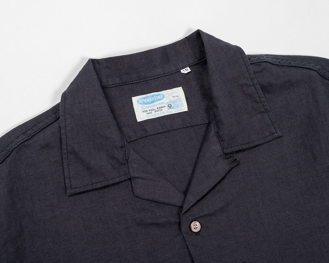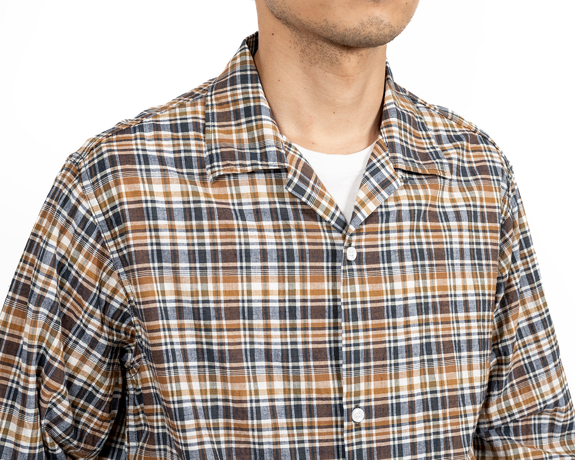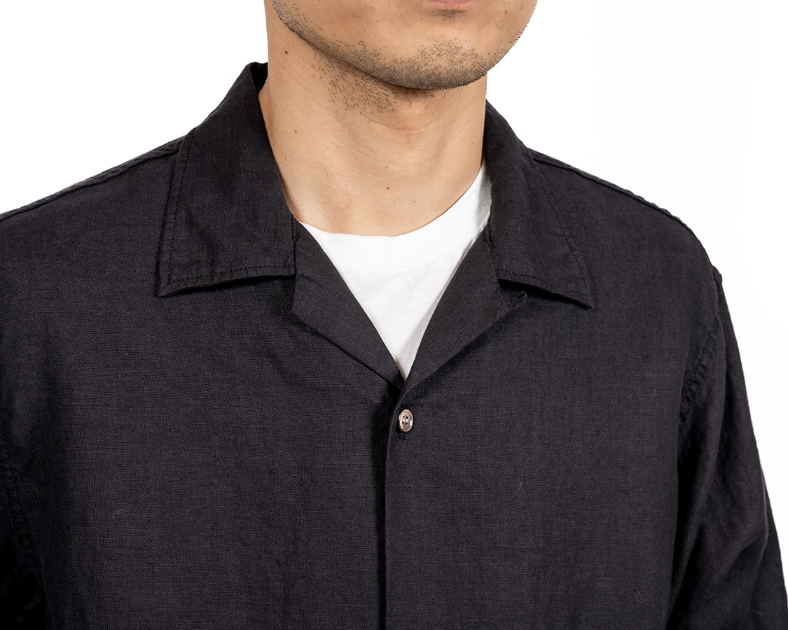 オープンカラー。その名の通り、台襟が無く、首回りが開いているのが特徴。中のTシャツは見えるので、ネックがしっかりした物を着ましょう。