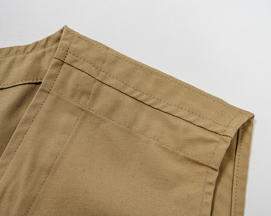 それはWORKERSの品質基準ではNG。でも、袖ぐりに見返し(別布)はつけたくない。そこで思いついたのが、肩の縫い代を倒して、そこを隠すように薄い布を当てる始末。結果、ステッチの入り具合がいかにも「機能性重視の服」のようでもあり、表に出るステッチがデザインにもなる。我ながら、良い仕様だと思います。