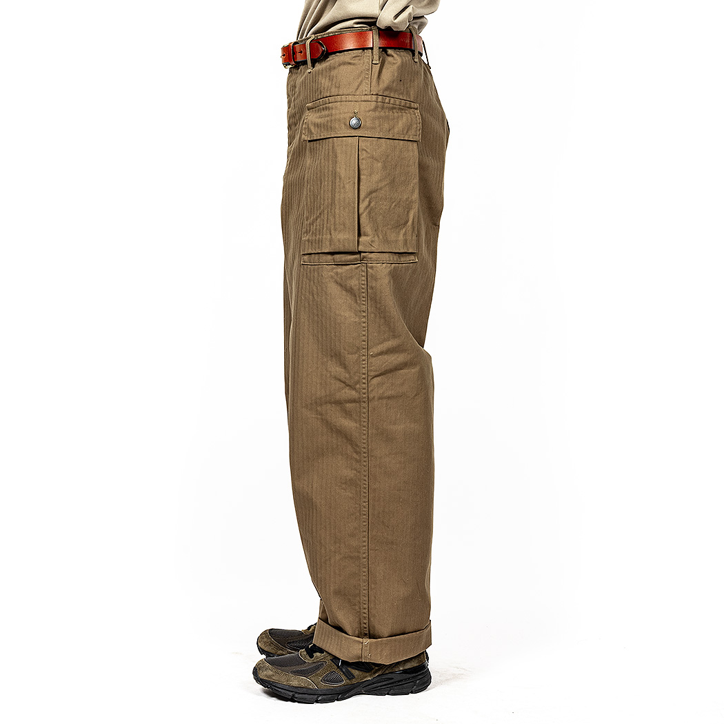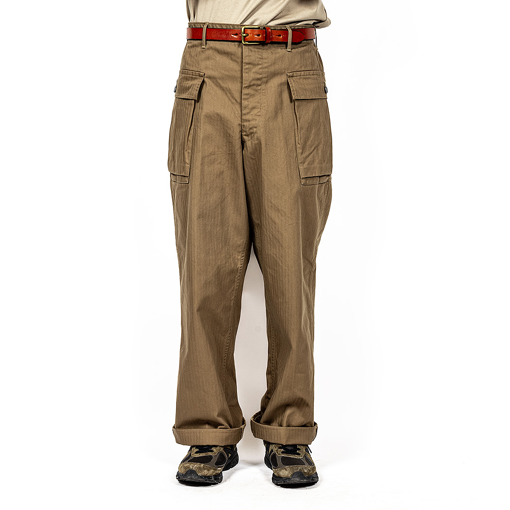 24春夏 で「軍パンが久しぶりに作りたいな~」と工場さんに相談すると「6ポケは絶対に作りません」と厳しい答え。そこで思い出したのがM-43。あの2 ポケならば蒸し暑い季節にも前・後ろにスレーキポケットが無く涼しい。